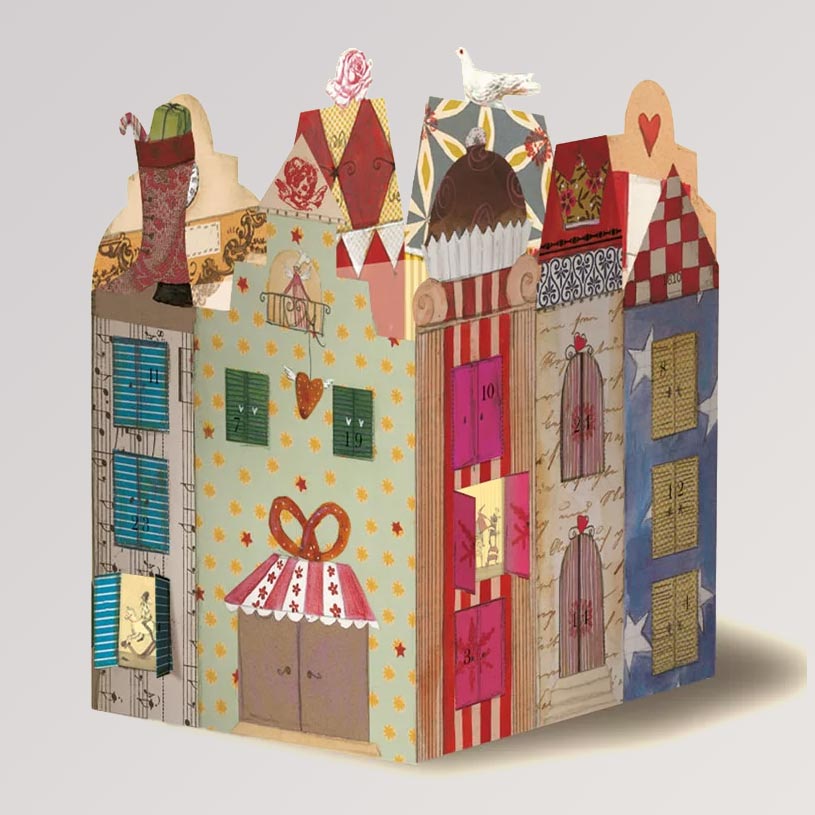 Vier kleine Stadthäuser, jede Fassade ein neues Detail – die Adventskalender-Leuchte „Häuser“ von Silke Leffler verwandelt die 24 Tage bis Weihnachten in ein leuchtendes Miniaturstädtchen. Ein Teelicht in der Mitte lässt Fenster, Läden und Girlanden warm erstrahlen – hinter jedem Fensterchen verbirgt sich eine weitere Überraschung.