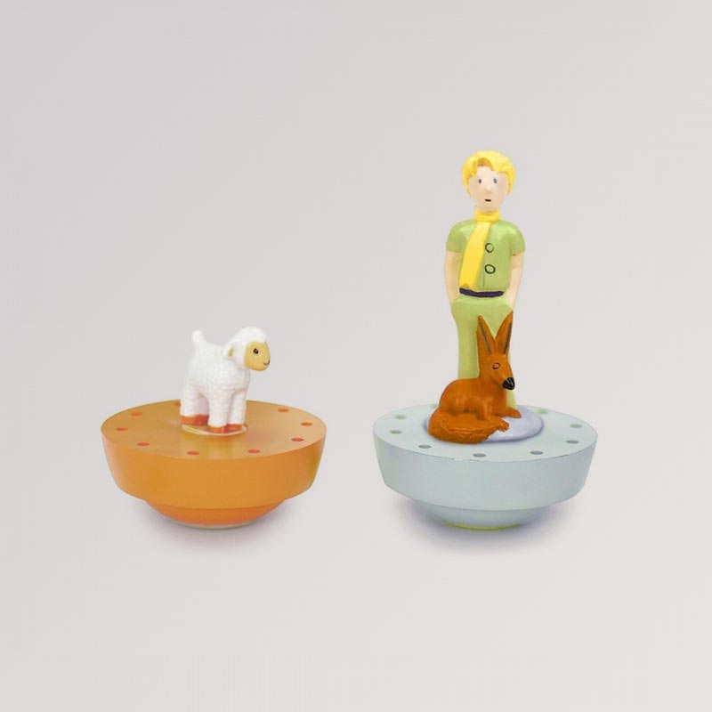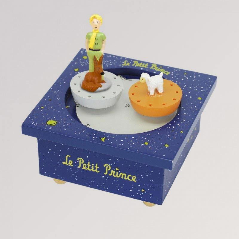 Diese liebevoll gestaltete Spieluhr von Trousselier bringt den Zauber des kleinen Prinzen ins Kinderzimmer. Auf der sternenklaren, dunkelblauen Box mit gelber Le Petit Prince-Schrift drehen sich zwei magnetische Figuren: der kleine Prinz mit seinem Freund, dem Fuchs, sowie das Schaf. Die Figuren stehen auf farbigen „Planeten“-Podesten (hellblau & orange), die den Tanz noch lebendiger wirken lassen.