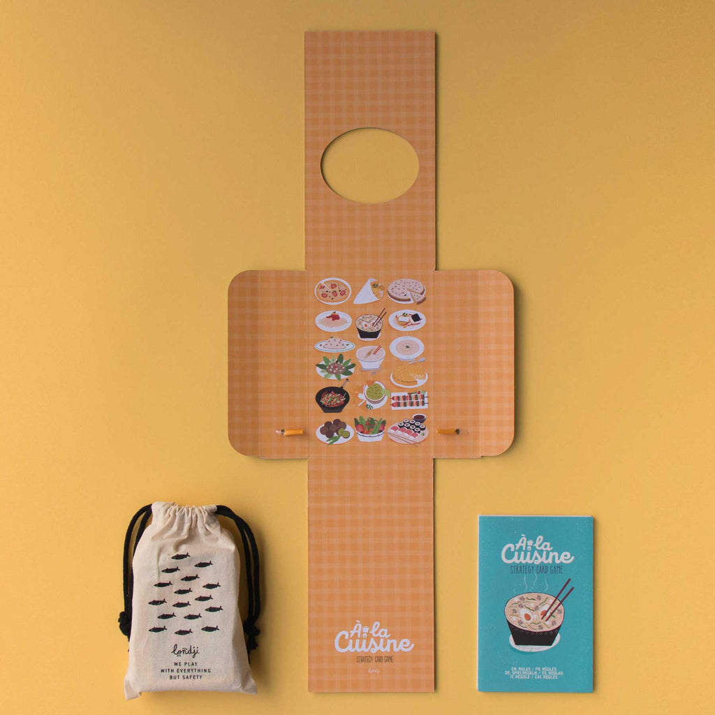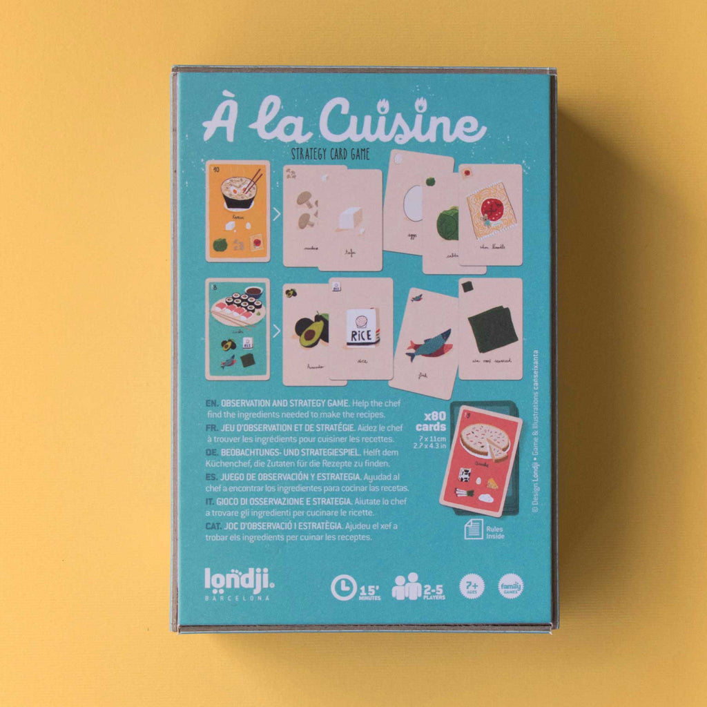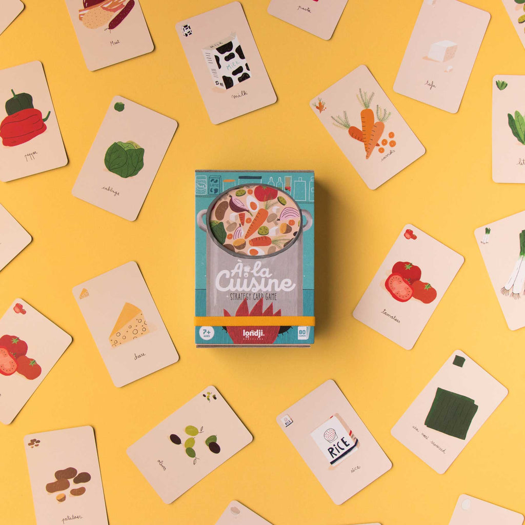 À la cuisine von Londji ist ein rasantes Strategiespiel für Kinder ab 7 Jahren. Ein zerstreuter Chefkoch hat die Zutaten verlegt – jetzt heißt es: Gemüse, Fisch, Reis & Co. blitzschnell finden und die leckersten Gerichte vollenden, bevor die Konkurrenz die Zutaten schnappt!