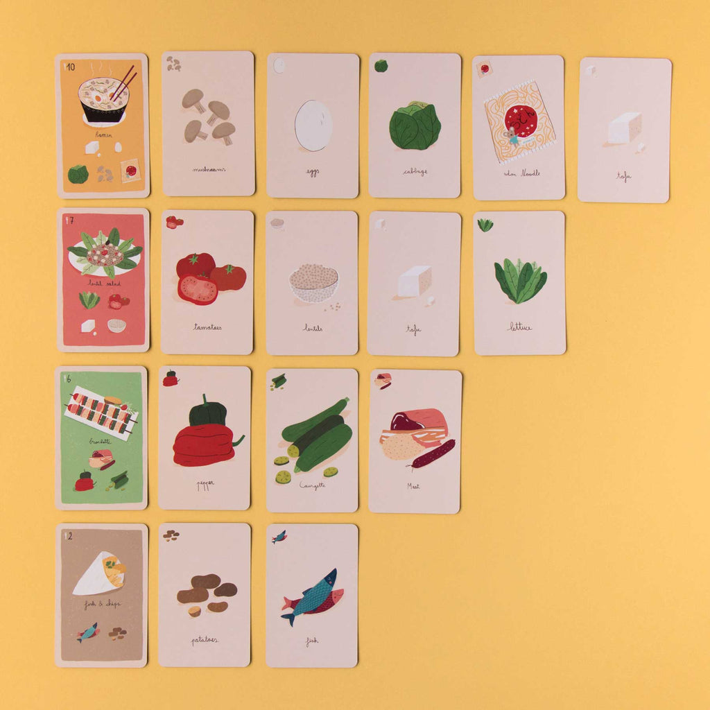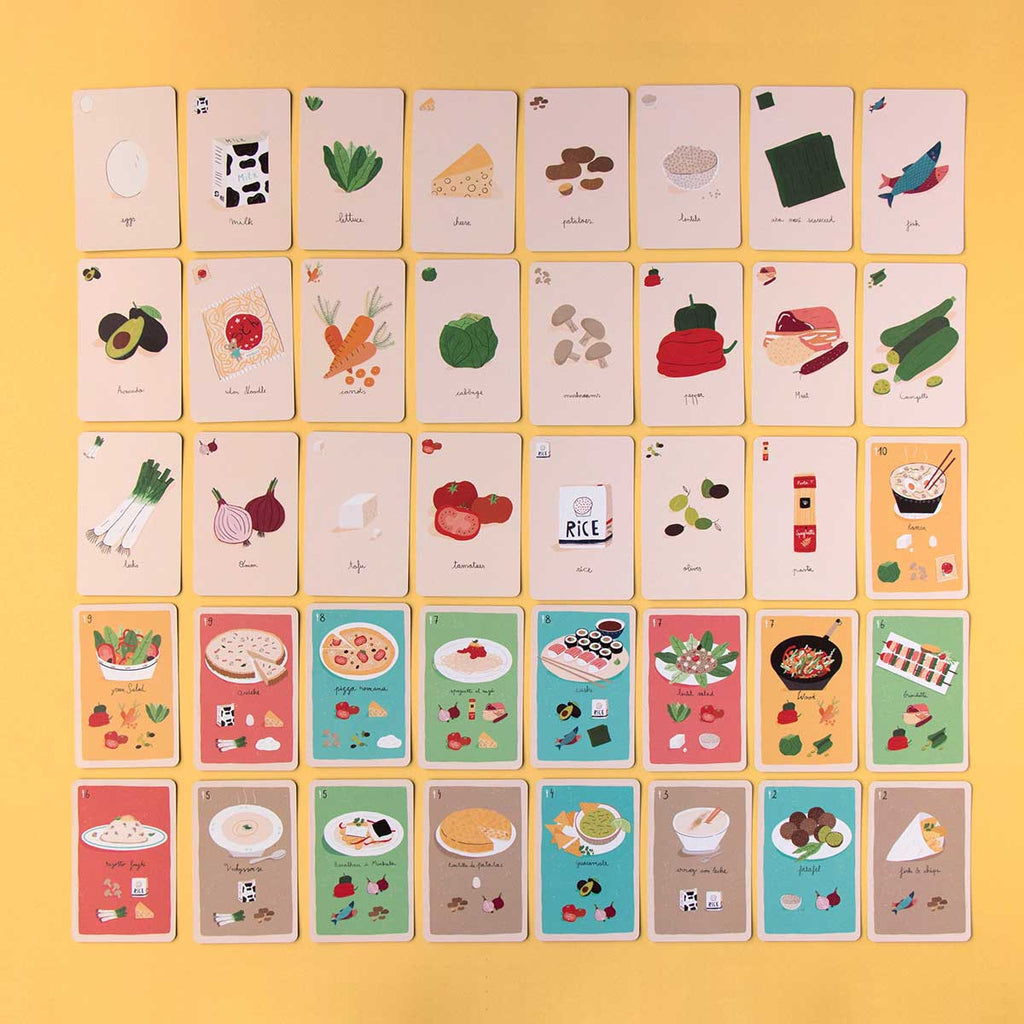 - 63 Zutatenkarten (Gemüse, Hülsenfrüchte, Fisch, Reis, usw.)