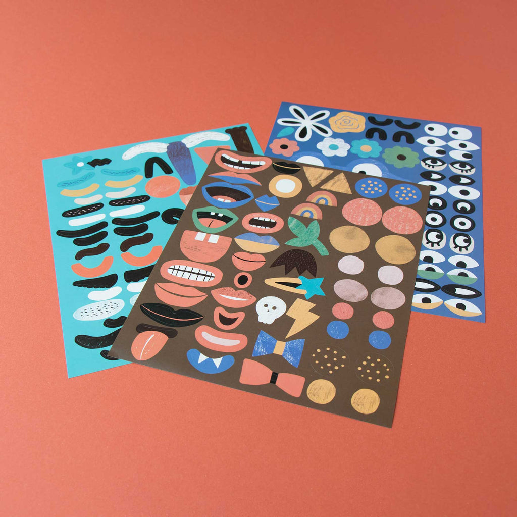 • 150 wiederablösbare Sticker (Gesichtsteile & Deko)