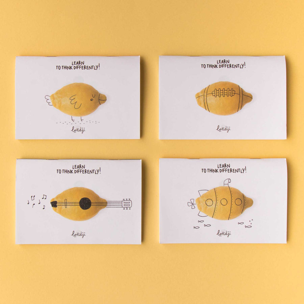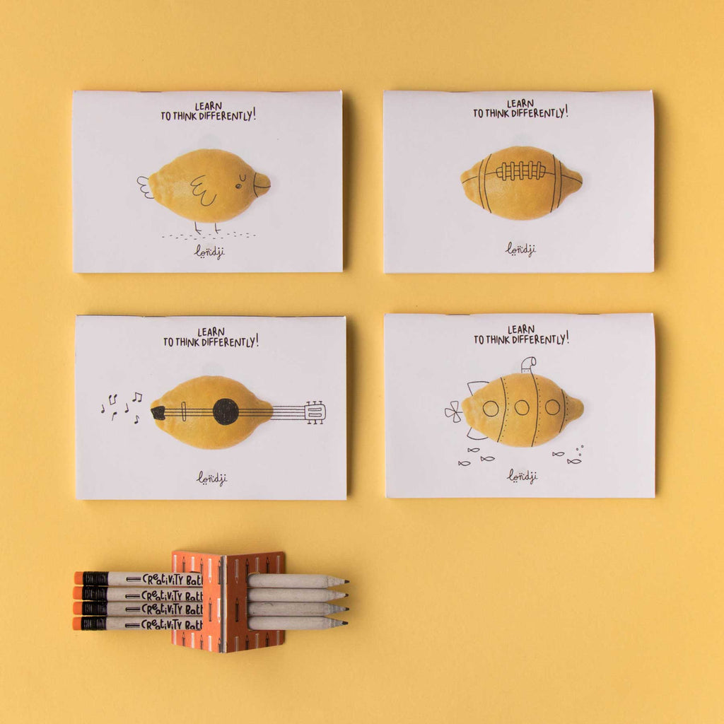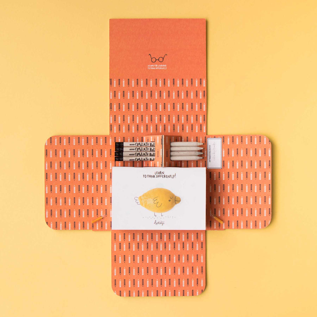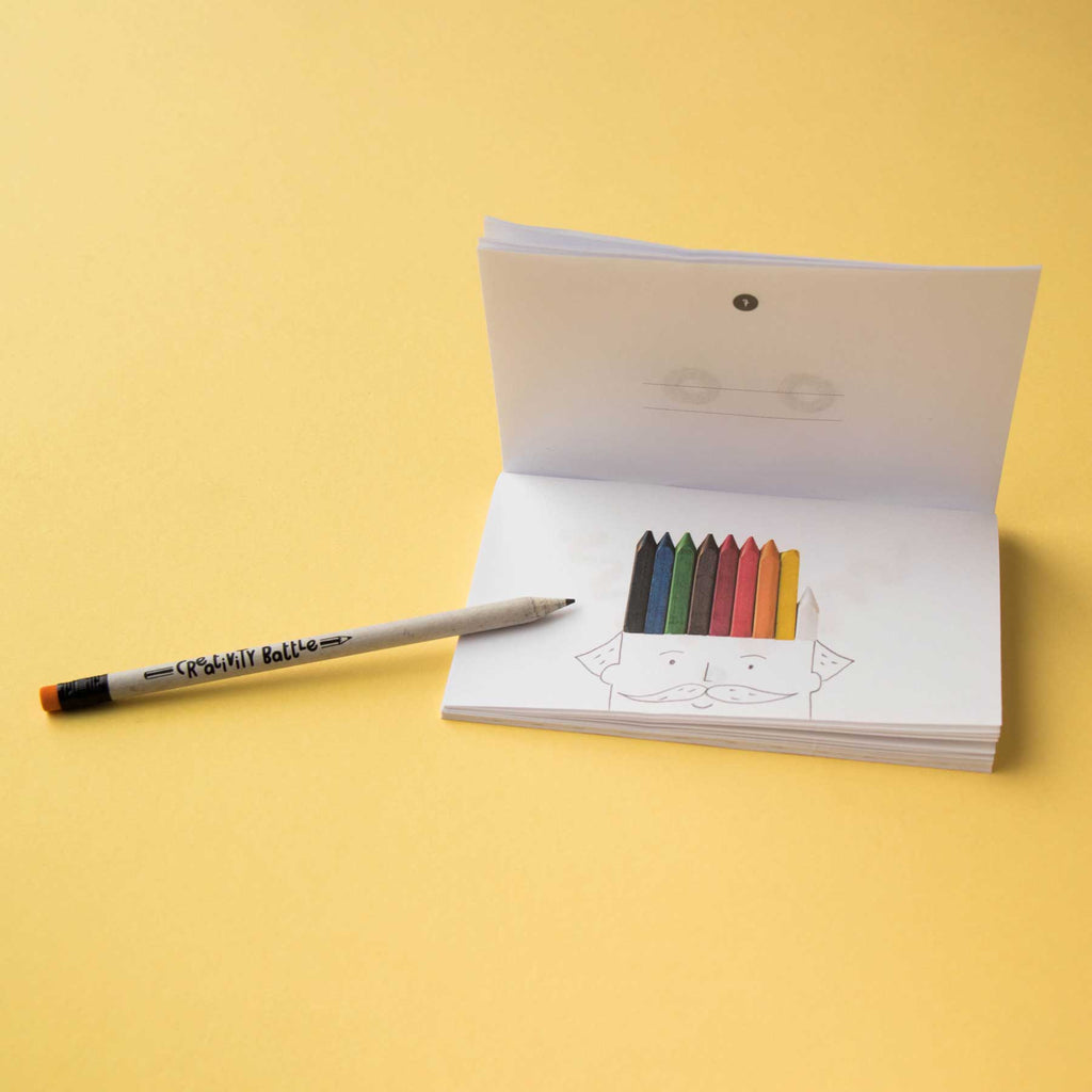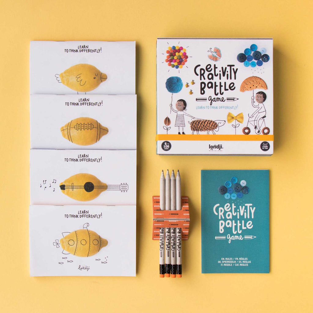 Creativity Battle ist das Ideen-Feuerwerk von Londji für Kinder ab 8 Jahren (mit Unterstützung ab 6 Jahren). Eine einfache Form (z. B. eine Zitrone) wird zum U-Boot, zur Gitarre, zum UFO – oder zu etwas, das noch niemand gesehen hat. Jedes Kind erhält Heft und Stift, wählt eine Seite und verwandelt die Vorlage in eine möglichst originelle Zeichnung. Danach werden die Ergebnisse gemeinsam bestaunt und die kreativsten Einfälle gekürt.
