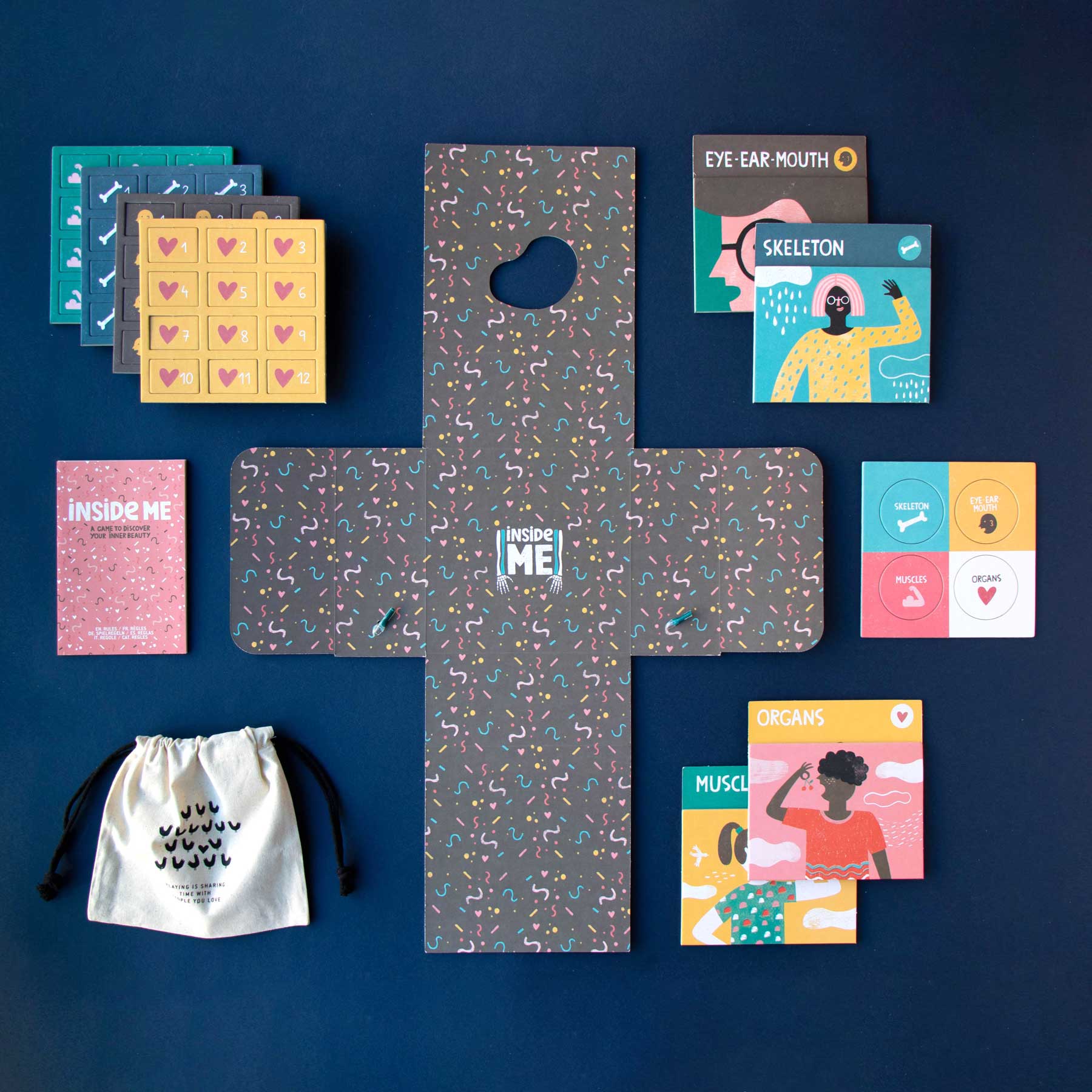 Inside Me ist ein liebevoll gestaltetes Lern- und Familienspiel, mit dem Kinder ab 7 Jahren die 96 wichtigsten Teile des menschlichen Körpers entdecken – spielerisch, kooperativ und mit viel Aha! Die großen Tafeln zu Skelett, Muskeln, Organen sowie Augen/Ohren/Mund führen Schritt für Schritt durch unseren Körper. Dank kurzer Runden und einfacher Regeln macht das Lernen richtig Spaß.