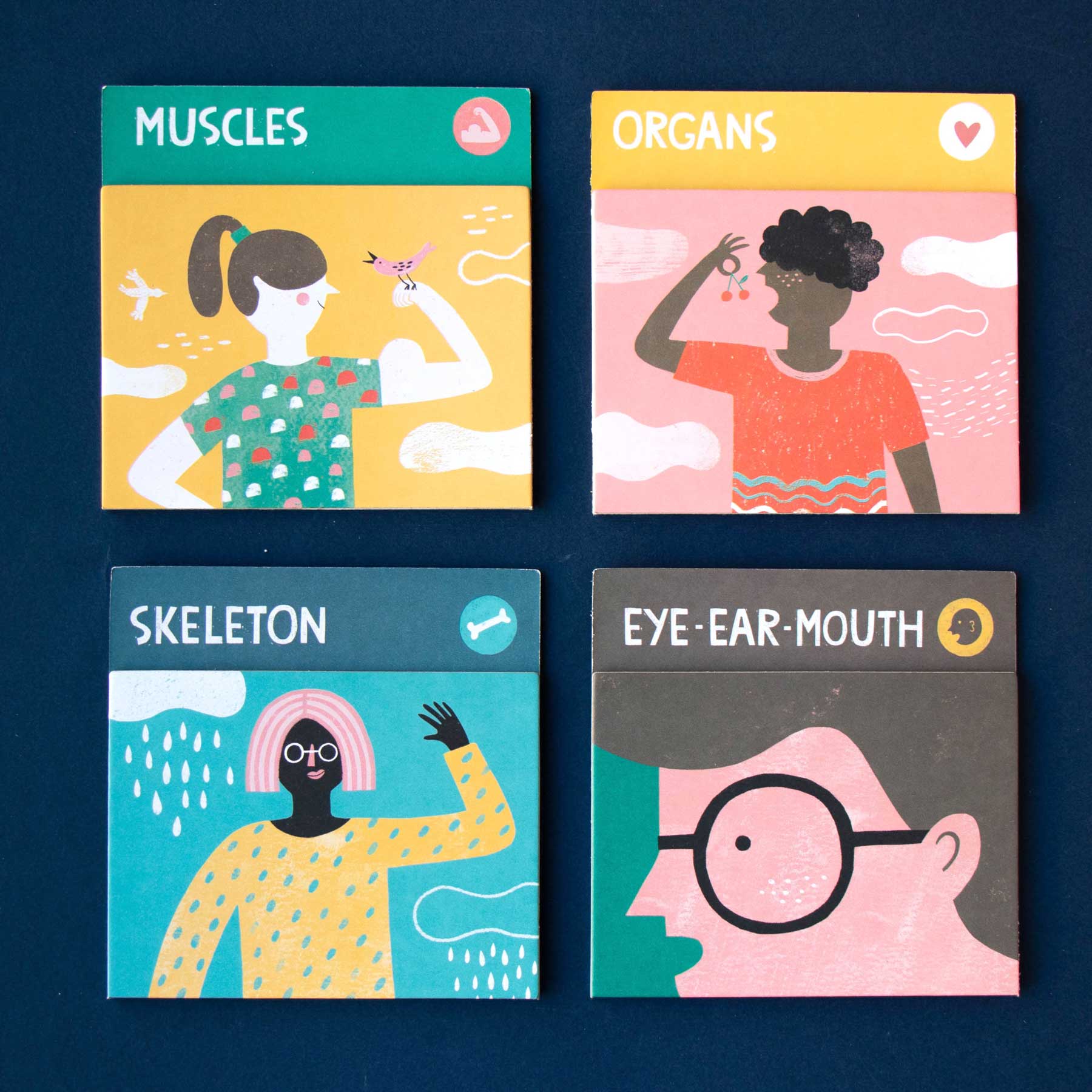 - 4 große Körperkarten: Skelett, Muskeln, Organe, Augen/Ohren/Mund