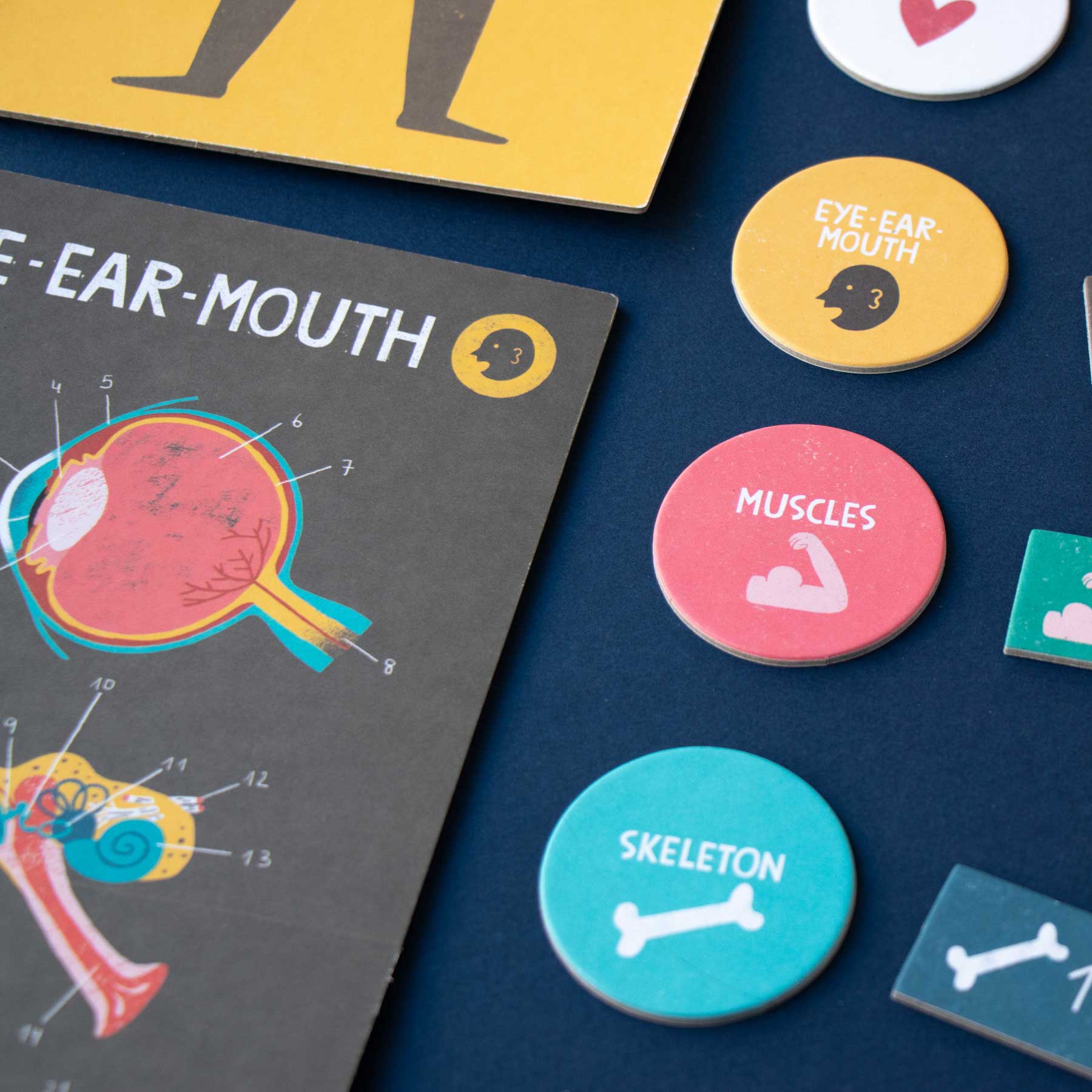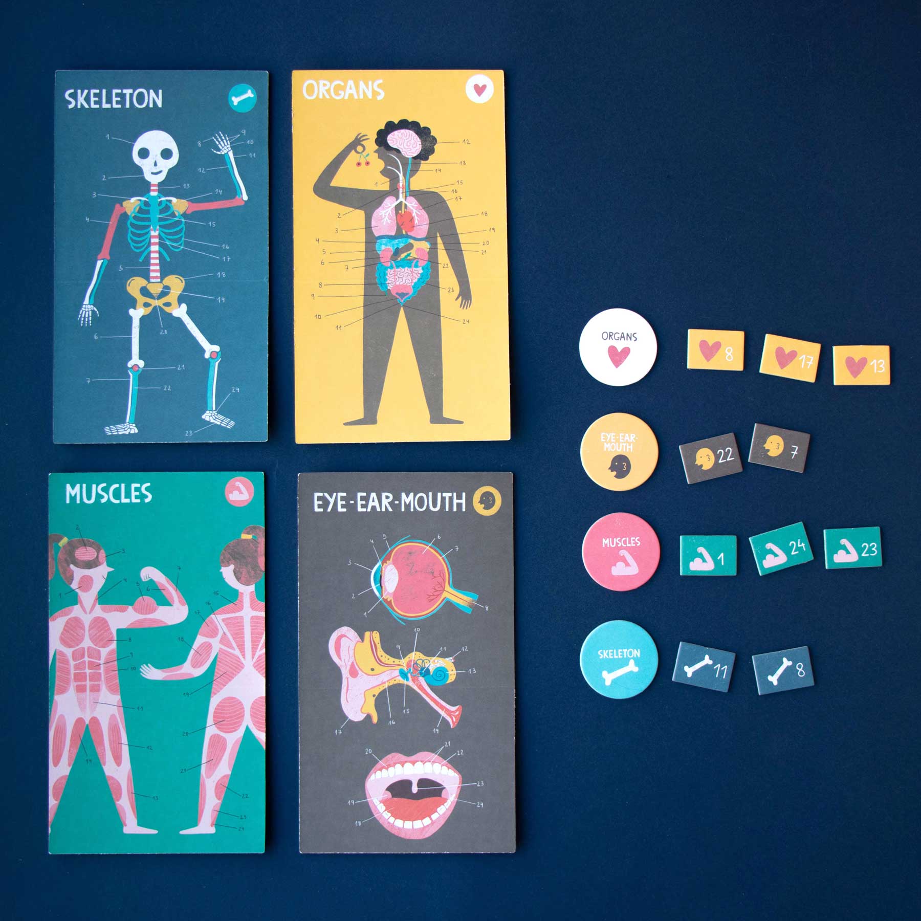 - Legt die 4 Körperkarten (Skelett, Muskeln, Organe, Augen/Ohren/Mund) und die 4 Rundkarten bereit.