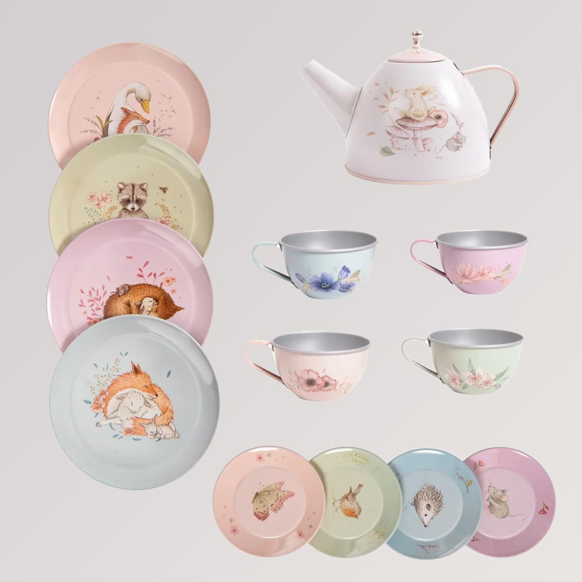 Das hochwertige Geschirrset aus lackiertem Weißblech ist detailverliebt illustriert und bietet alles, was man für eine stilvolle Tee-Runde braucht: Tassen, Unterteller, kleine Teller, eine Teekanne mit Deckel – und natürlich ein Tablett zum Servieren.