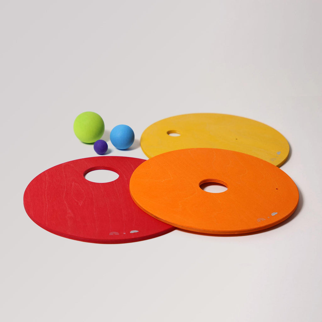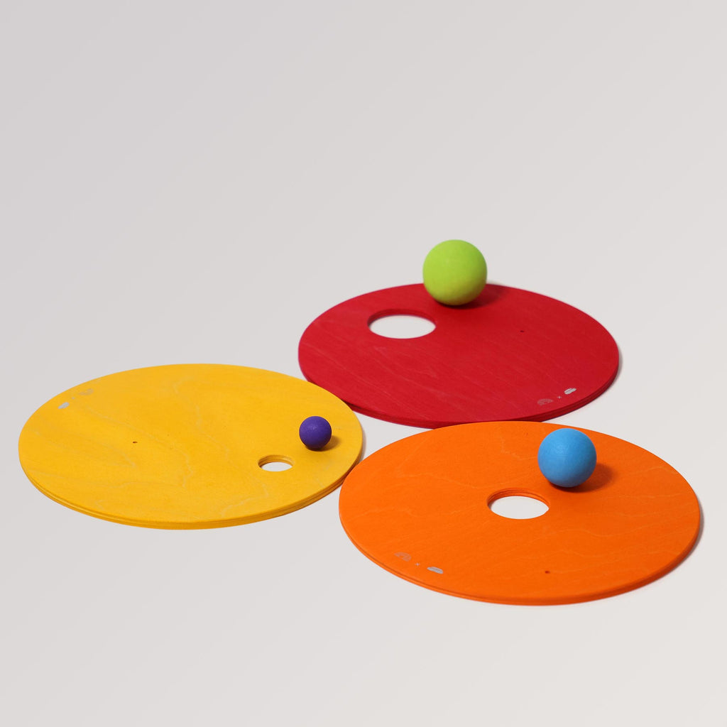 Enthalten sind drei massive Holzscheiben in den Farben Gelb, Orange und Rot. Jede Scheibe verfügt über eine unterschiedlich große Öffnung, in die jeweils eine der drei mitgelieferten Holzkugeln (20 mm, 35 mm, 45 mm) perfekt hineinpasst. So entstehen spannende Kullerspiele mit verschiedenen Schwierigkeitsgraden.