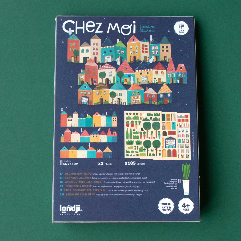 Willkommen in meiner Straße! Mit dem Kreativ-Set „Chez Moi“ von Londji gestalten Kinder bunte Häuserzeilen immer wieder neu. Die Sticker sind wiederverwendbar – so lassen sich Fenster, Türen, Bäume, Läden & Figuren beliebig versetzen und die Szene jedes Mal anders erzählen. Ideal für freies Gestalten, Rollenspiel und erstes Stadtplanen.