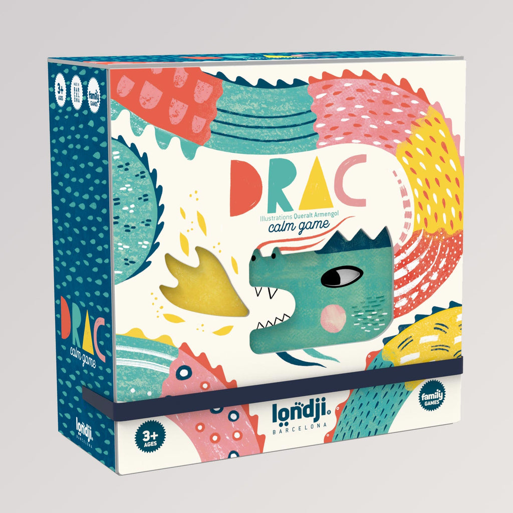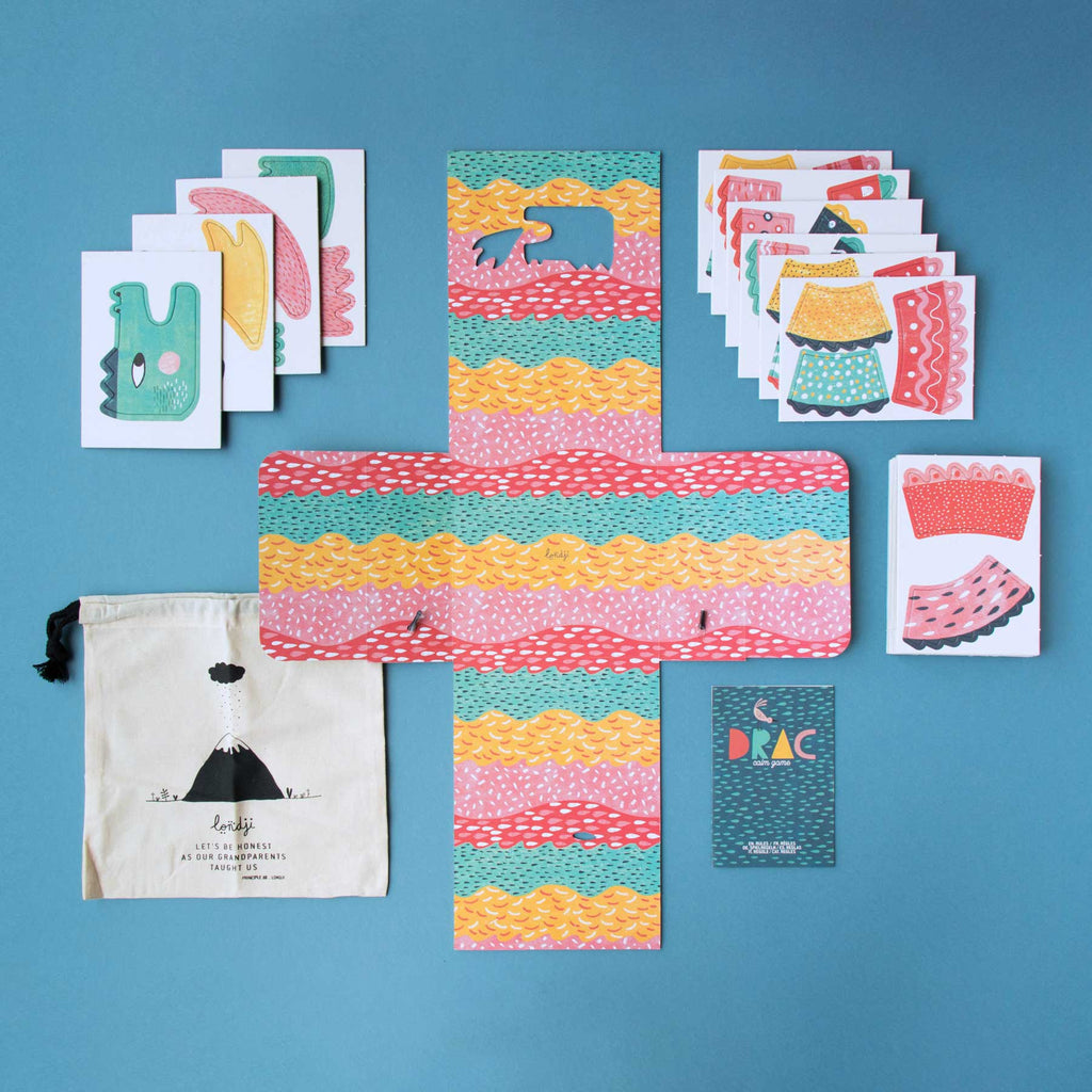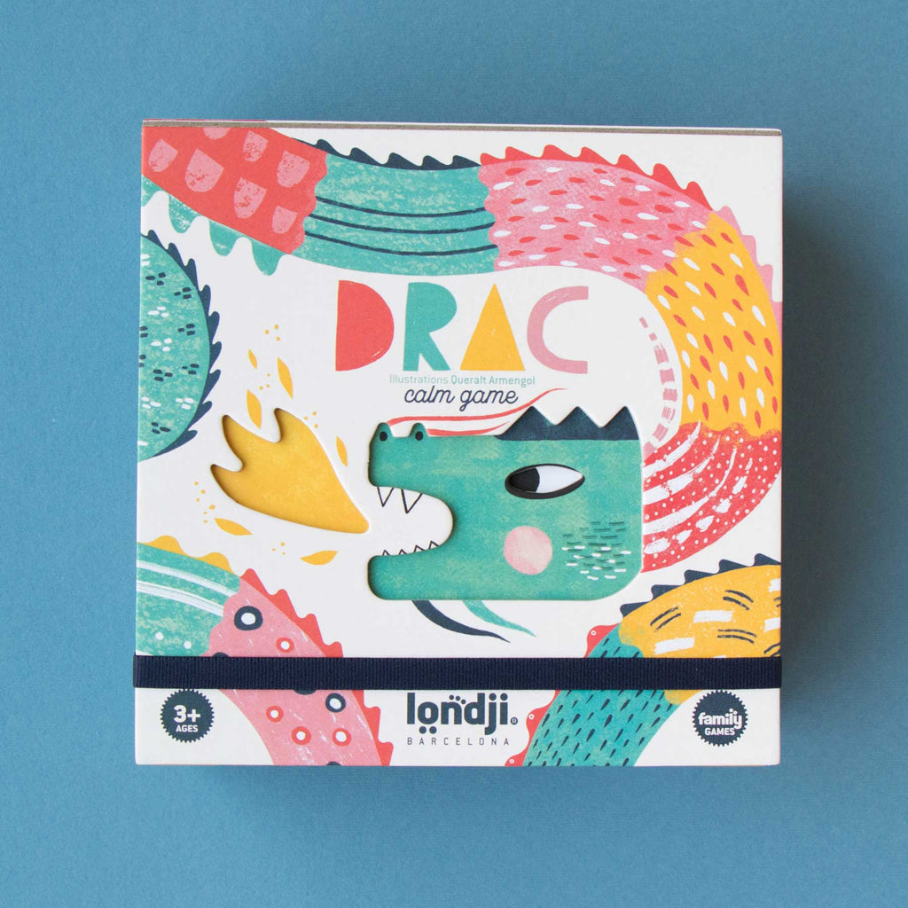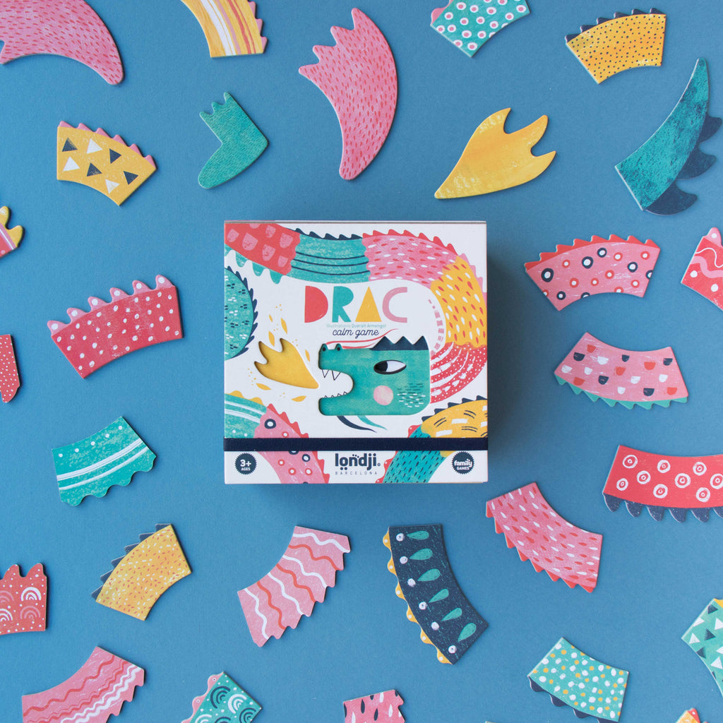 Drac Game ist Londjis wunderbar ruhiges Kreativspiel: Kinder ab 3 Jahren legen aus bunten, beidseitig bedruckten Kartonteilen ihren ganz eigenen Drachen – mal kurz und witzig, mal lang wie eine Schlange. Flügel, Rückenstacheln, Schwanzspitzen und der Drachenkopf lassen sich immer wieder neu kombinieren. Ohne feste Regeln, dafür mit viel Raum für Fantasie, Konzentration und ein achtsames Miteinander.