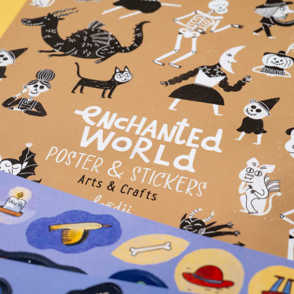 Das große Poster zeigt einen nächtlichen Schloss-Innenhof – Mond, Tore und Lichterketten inklusive. Die 152 wiederablösbaren Sticker (u. a. Geister, Hexen, Vampire, Fledermäuse, schwarze Katzen, Kürbisse & skurrile Partygäste) bringen die Szene zum Leben und laden zum Erzählen eigener Geschichten ein.