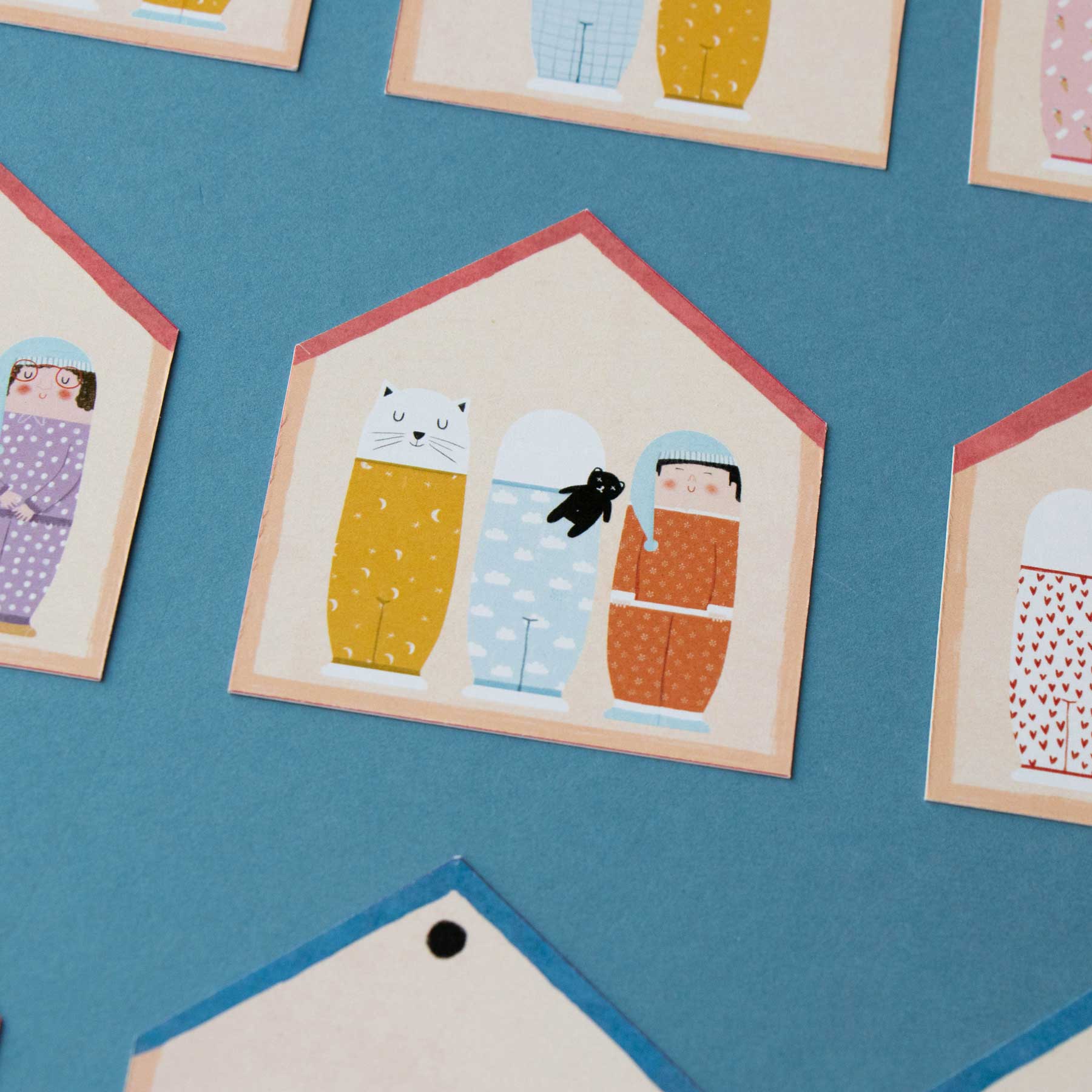 In diesem Modus wird jede Spielkarte zu einer kleinen Detektivaufgabe. Eine Hauskarte zeigt eine Familie mit bestimmten Merkmalen – z.B. „zwei Figuren mit Brille“ oder „alle mit gestreiftem Pyjama“. Nun heißt es: Wer findet die passenden Figuren im Bett? In der einfachen Variante (blau) reicht es, eine passende Figur aufzudecken. In der schwierigen Version (rot) muss ein Spieler in einem einzigen Zug alle passenden Familienmitglieder finden. Nur wer genau beobachtet und logisch kombiniert, sammelt die meisten Karten und gewinnt.