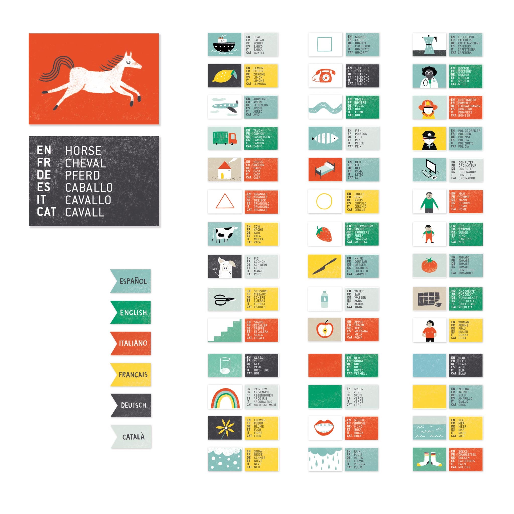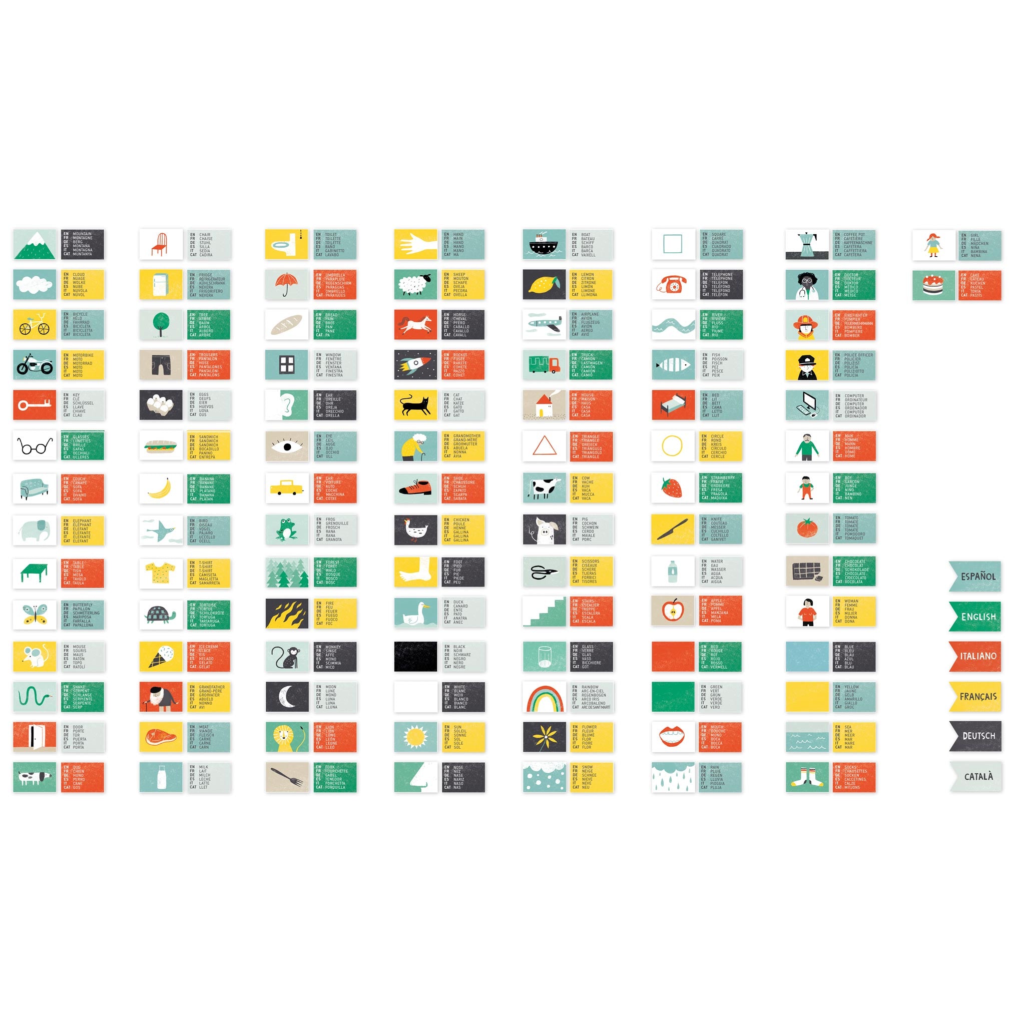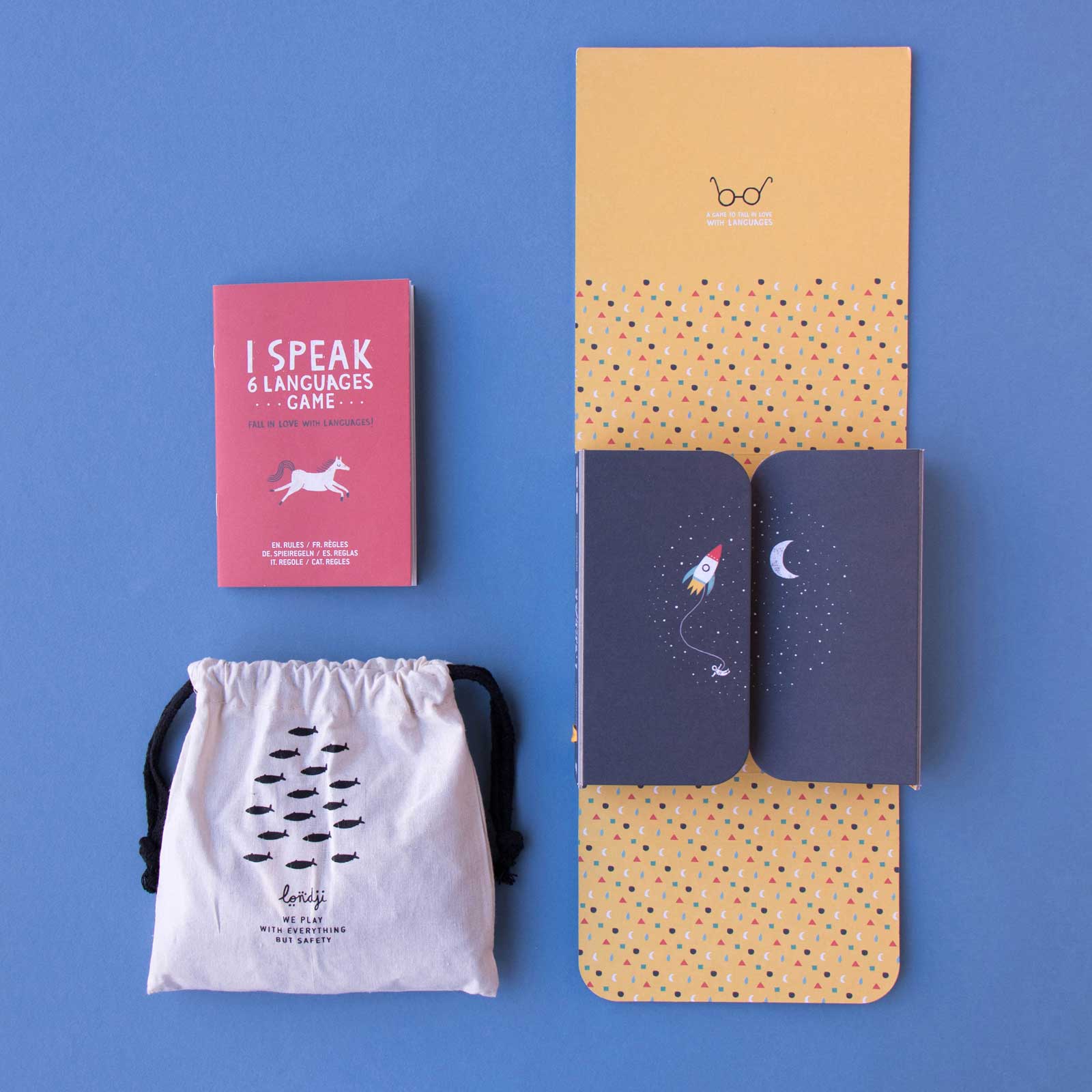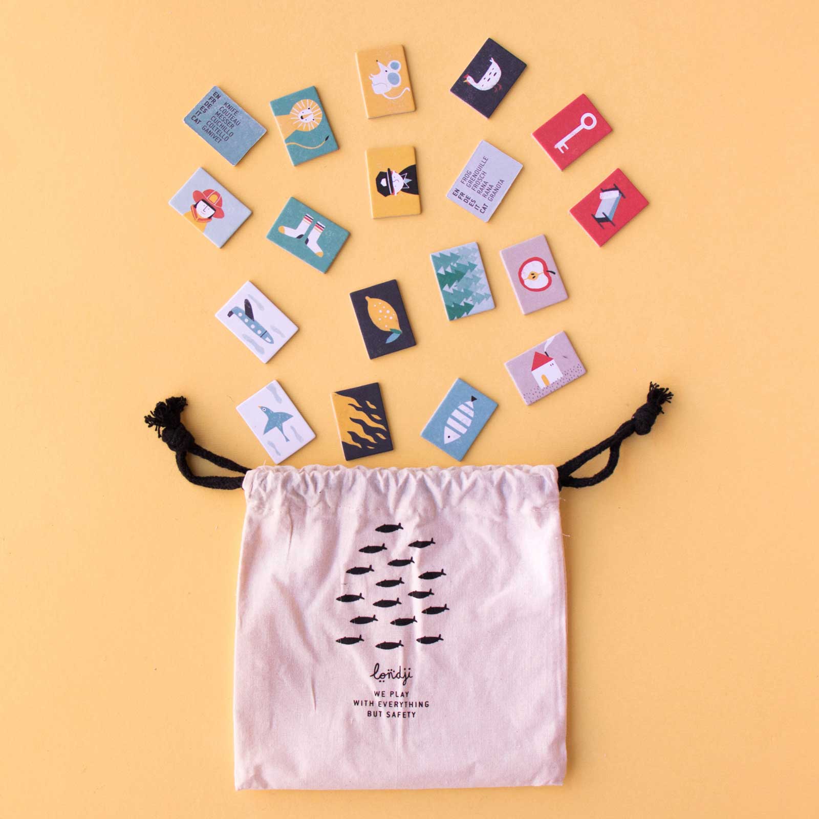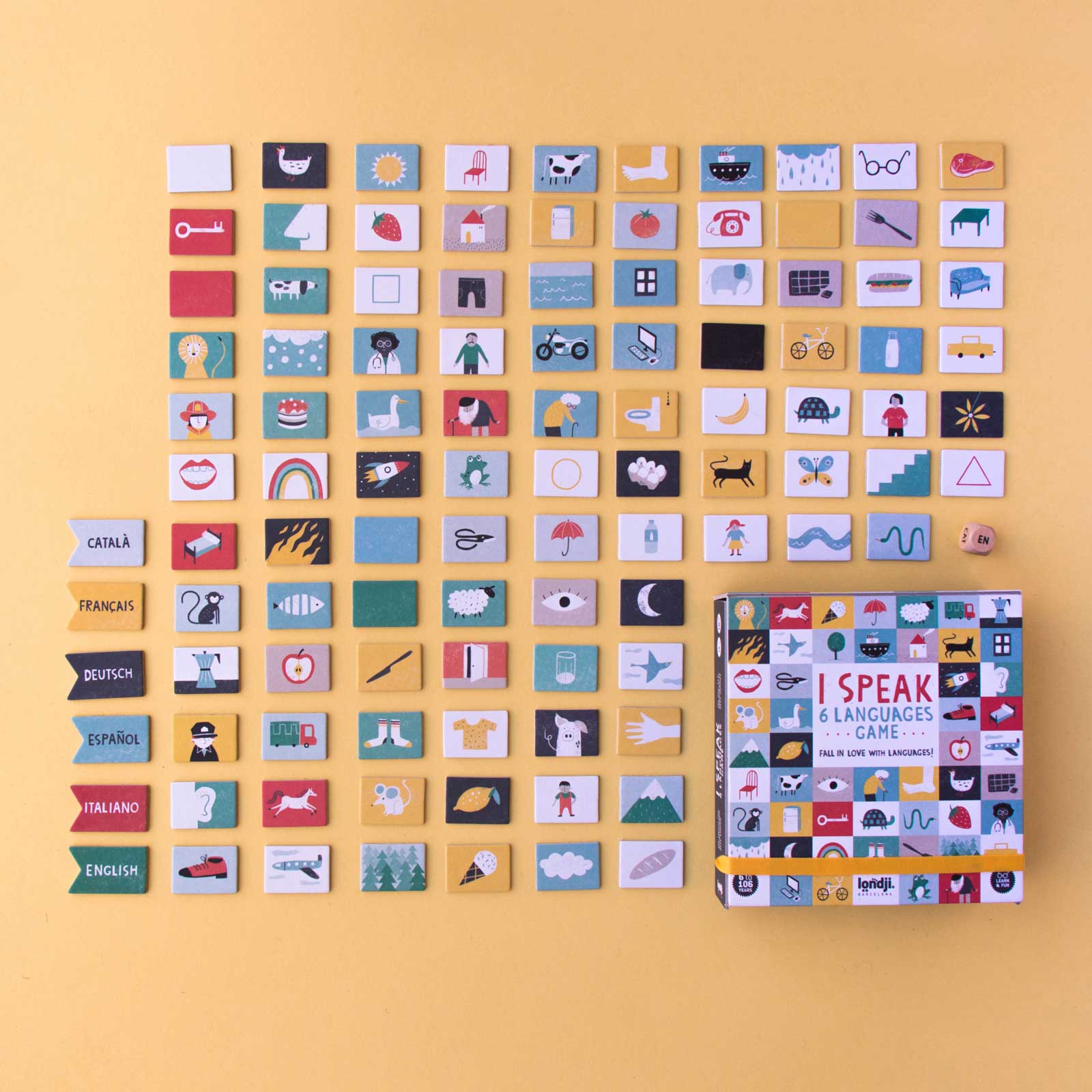 - Inhalt: 100 illustrierte Wort-Chips, 6 Sprachflaggen, 1 Würfel, Baumwollbeutel