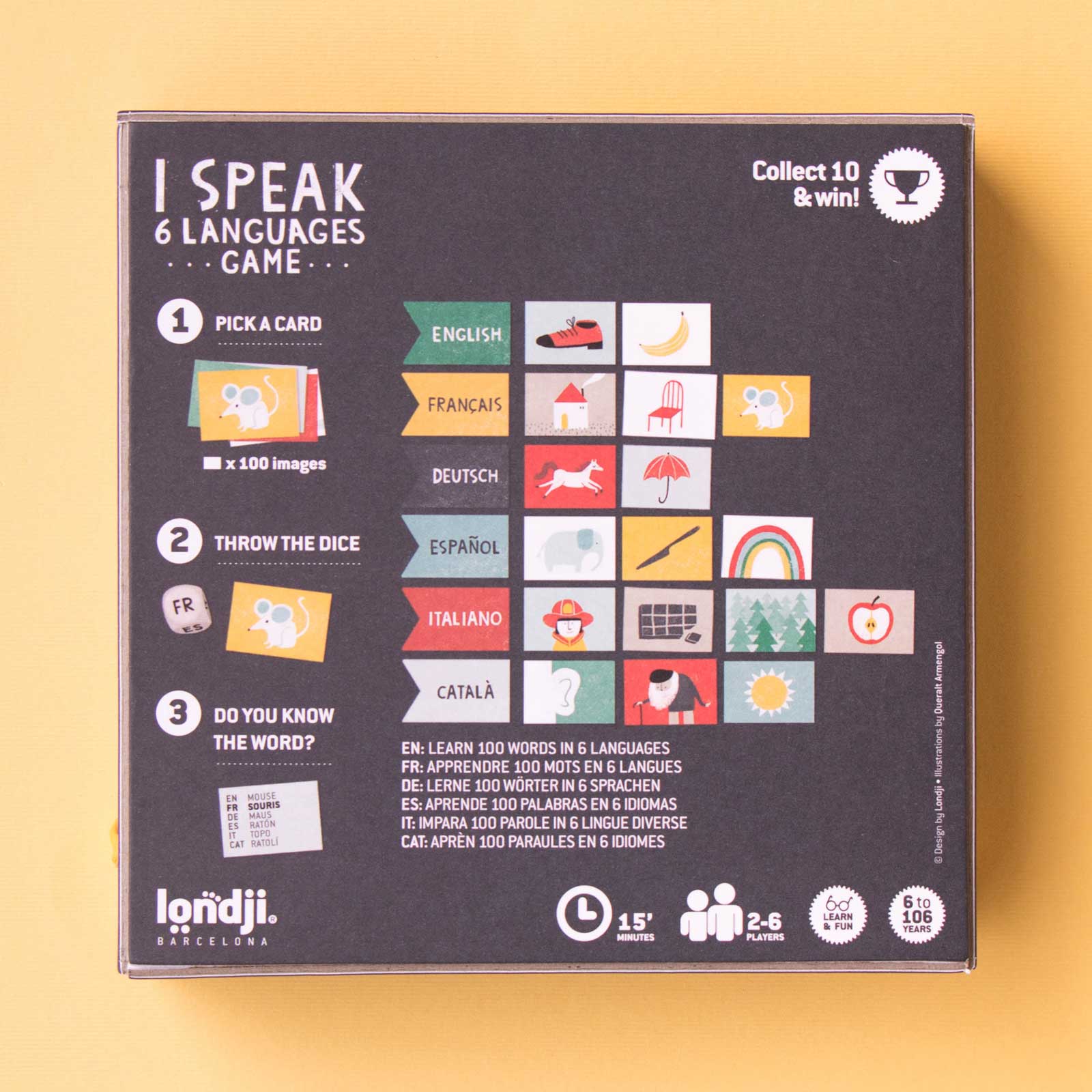 Wie sagt man „Apfel“ auf Spanisch? Oder „Schlange“ auf Englisch? „I speak 6 languages“ von Londji ist ein unterhaltsames Lernspiel, bei dem Kinder spielerisch Vokabeln in sechs verschiedenen Sprachen entdecken – neben Deutsch auch Englisch, Französisch, Italienisch, Spanisch und Katalanisch. In liebevoll illustrierten Bildern und mit einem spannenden Spielmechanismus wird Sprachvielfalt zur spielerischen Herausforderung.
