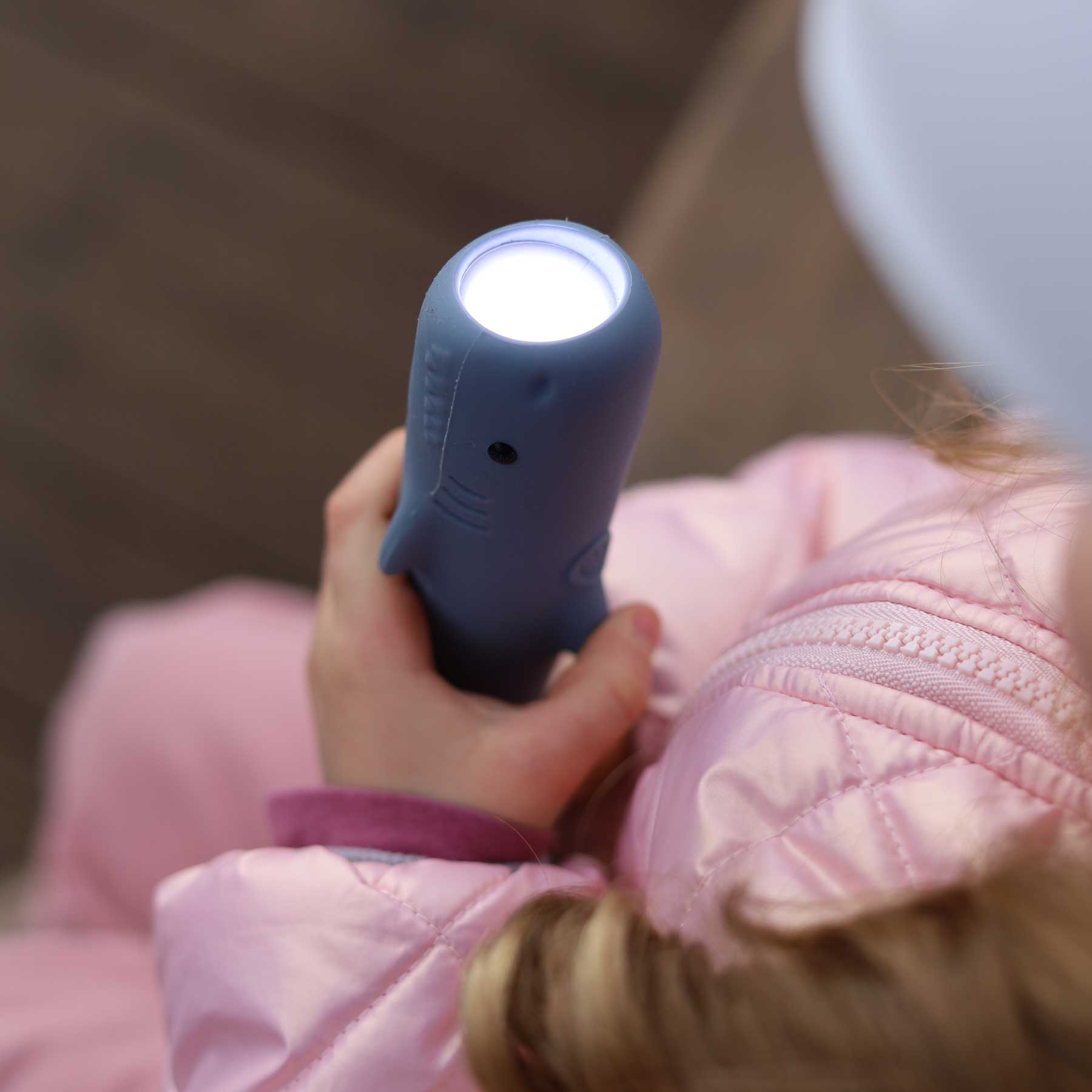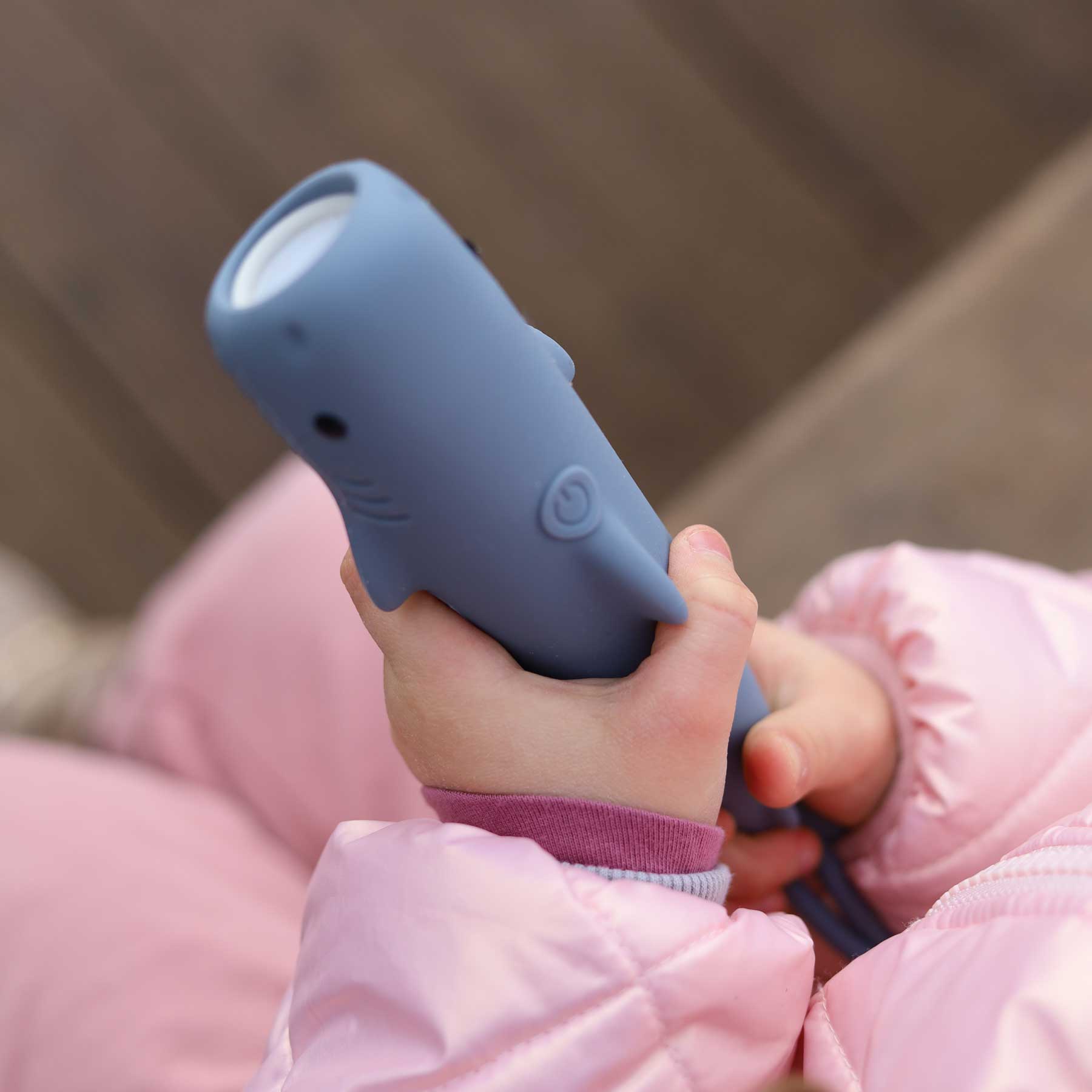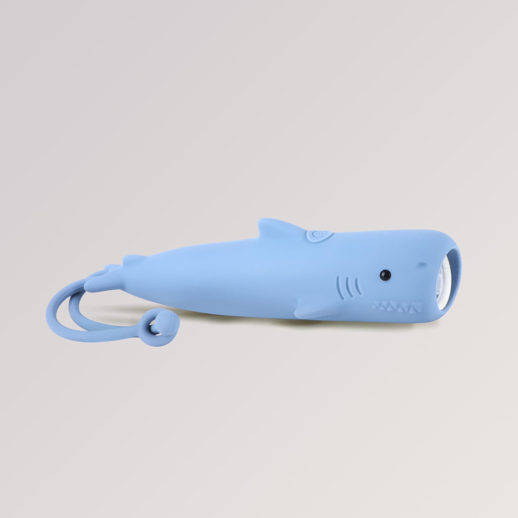 Die Taschenlampe Hai von Rabbit & Friends ist ein freundlicher Begleiter für Kinderhände: weich ummantelt mit BPA-freiem Silikon, angenehm griffig und mit liebevollen Details gestaltet – so wird aus jeder dunklen Ecke im Kinderzimmer, unter der Bettdecke oder draußen in der Dämmerung ein kleines Abenteuer.