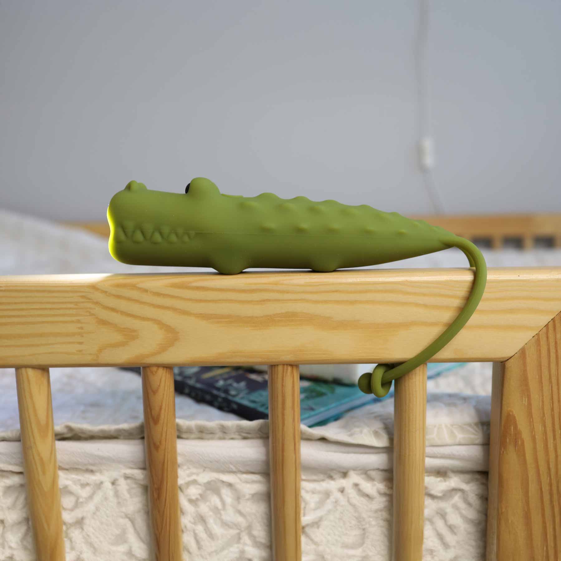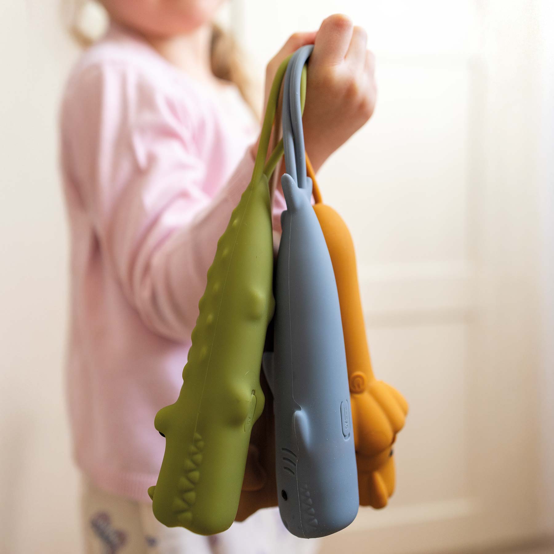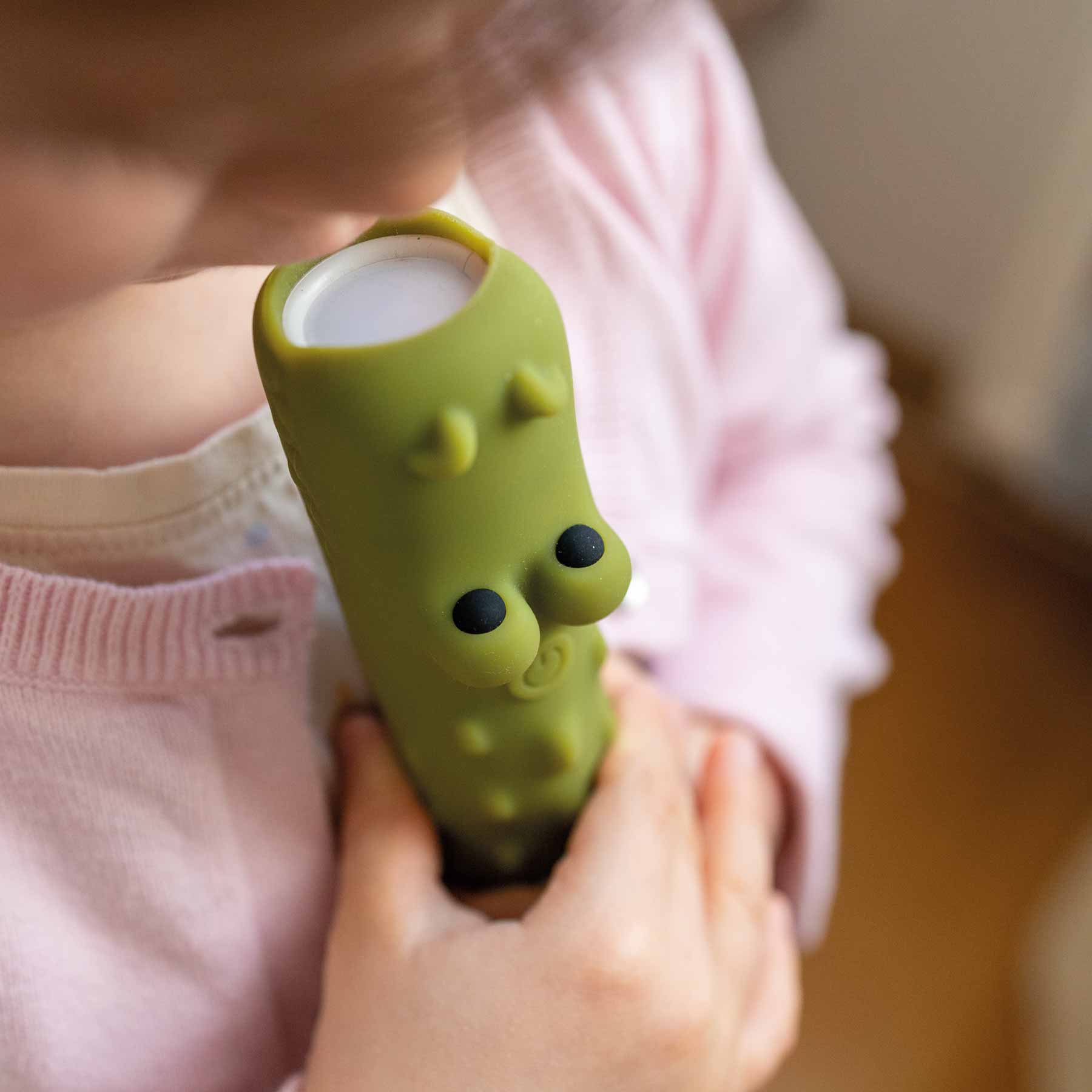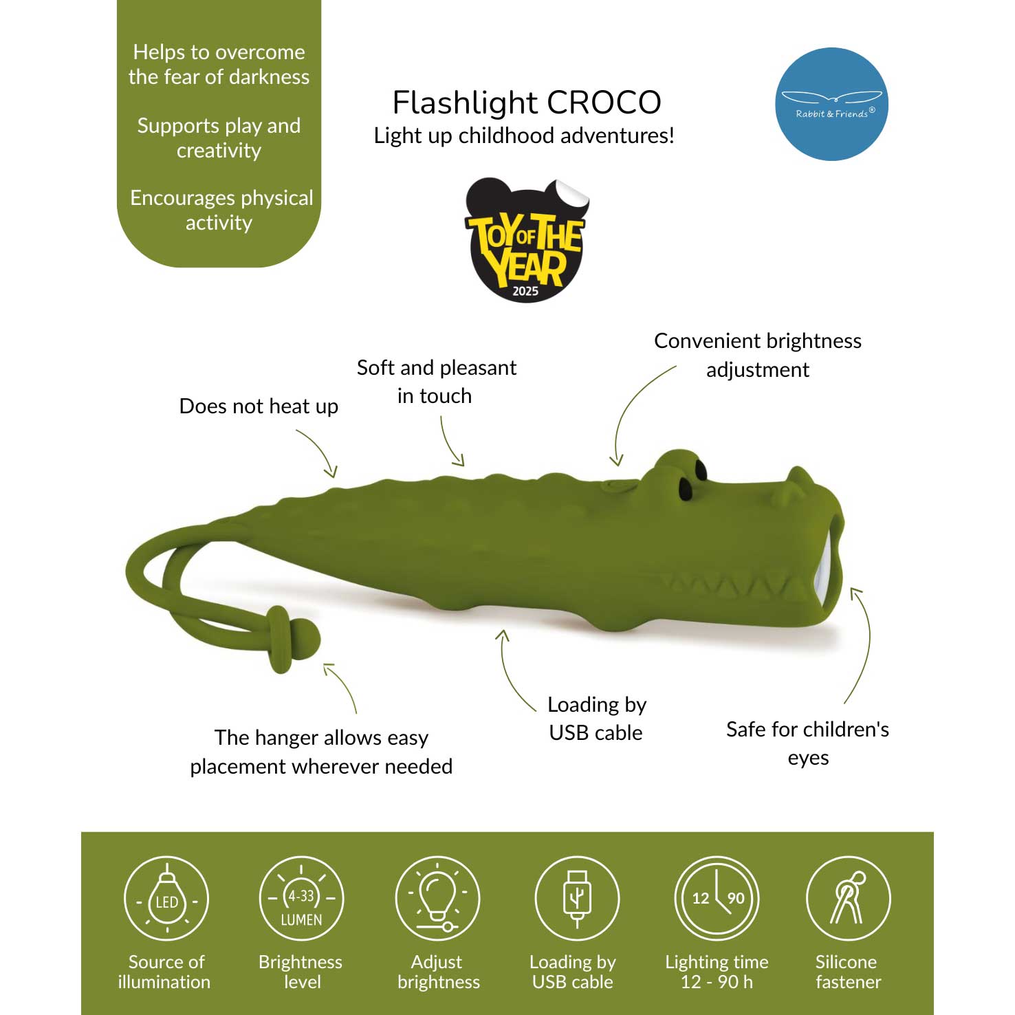 Die Taschenlampe Krokodil von Rabbit & Friends ist ein liebevoll gestalteter Begleiter für Kinderhände: weich ummantelt mit BPA-freiem Silikon, griffig durch die kleinen Noppen und so charmant, dass sie am liebsten überall mit hin möchte – ins Kinderzimmer, in die Höhle unter der Bettdecke oder raus in die Dämmerung.