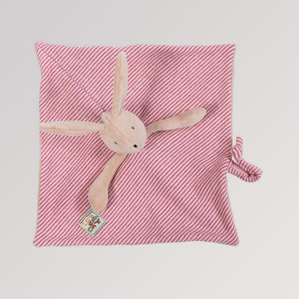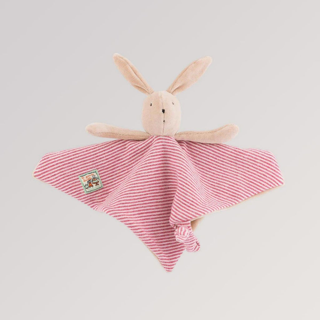 Das Schmusetuch Sylvain von Moulin Roty wirkt wie ein sanfter Freund: oben ein niedlicher Häschenkopf mit langen Ohren, darunter ein weiches Tuch, das sich an Babys Wange oder am kleinen Körper wunderbar anschmiegt. Das zarte Ringelmuster in warmem Rotweiß macht es zeitlos schön – und die kleinen Zipfel (mit Knoten) sind perfekt, damit winzige Hände etwas zu fassen bekommen.