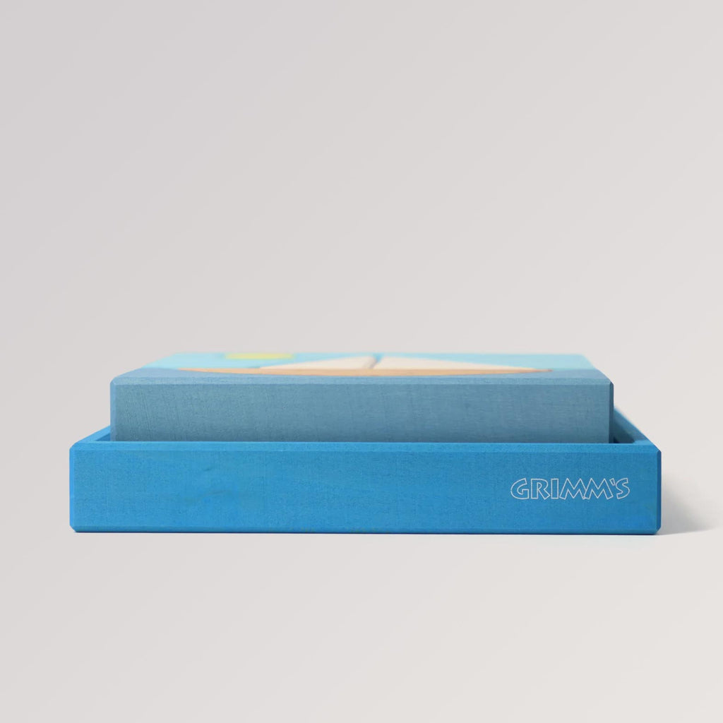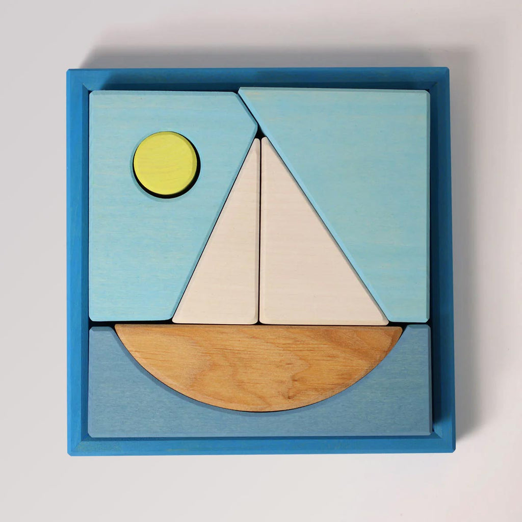 Blau wie das Meer: Im Rahmen zeigt das Bauspiel Blau eine ruhige Szene – ein Segelboot gleitet über sanfte Wellen, die Sonne leuchtet gelb. Die klaren, geometrischen Teile (Dreiecke, Zylinder, Halbkreis, Rechtecke, Bogenelement) laden schon im Bild zum Entdecken ein.