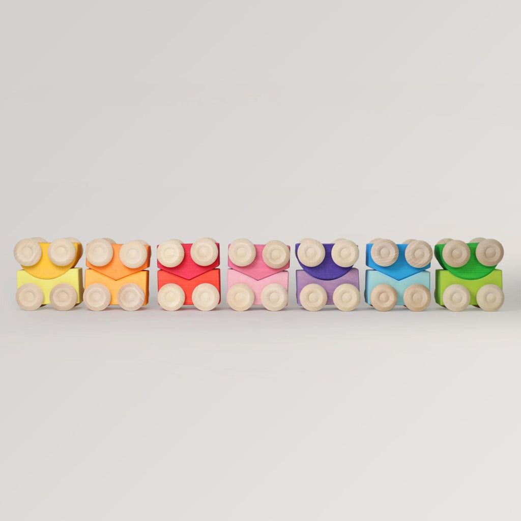Ob als erstes Schiebeauto, als Mini-Transporter für Ringe und Klötze oder als kippelige Stapel-Challenge – die kompakten Flitzer wachsen mit den Fähigkeiten mit und sind ideal kombinierbar mit anderen Grimm’s Bauteilen.