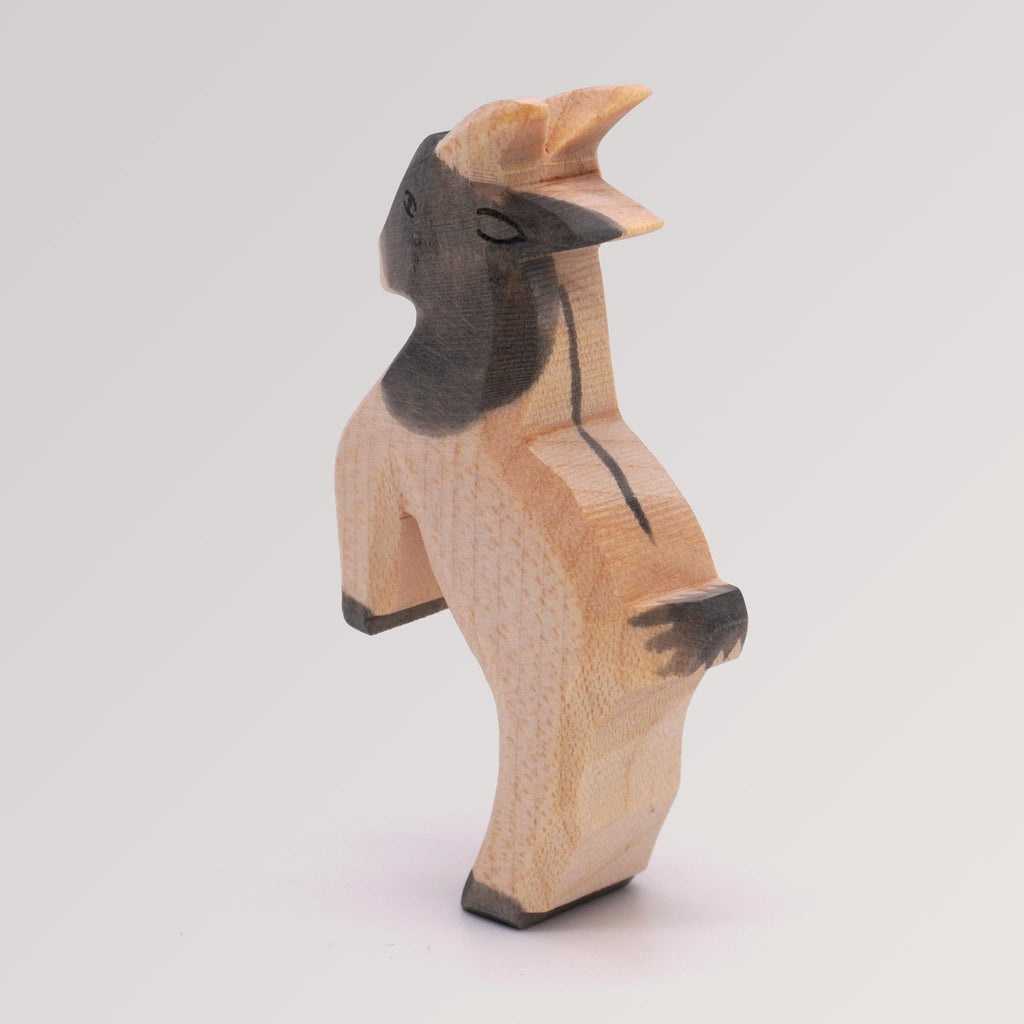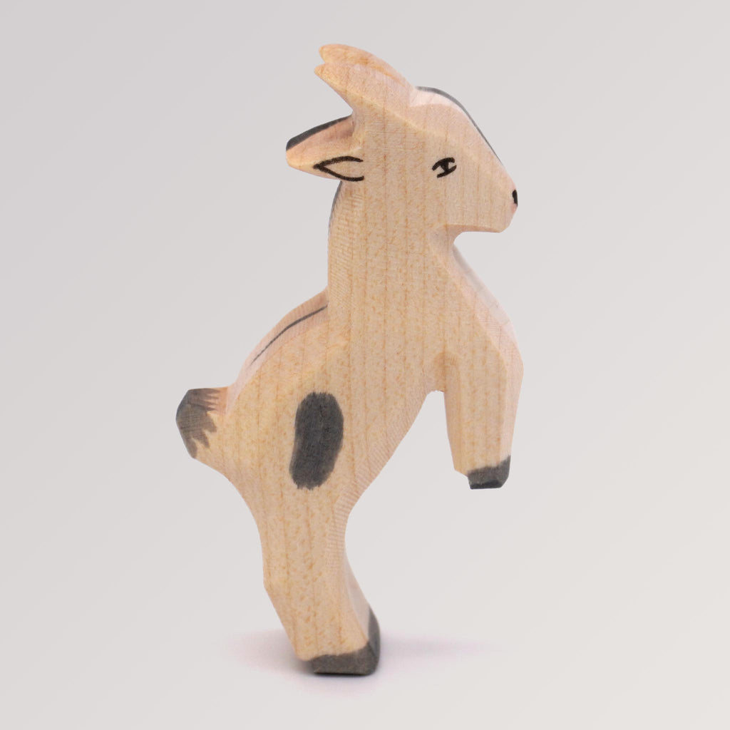 Holzfigur Zicklein springend von Ostheimer, in reiner Handarbeit aus massivem Ahornholz heimischer Wälder hergestellt. Die verwendeten Farben bestehen aus gesundheitlich unbedenklichen, biologischen Naturölen und wasserlöslicher Holzbeize.