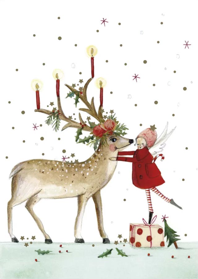 Festliche Postkarte – Rentier & Engel im Silke-Leffler-Stil