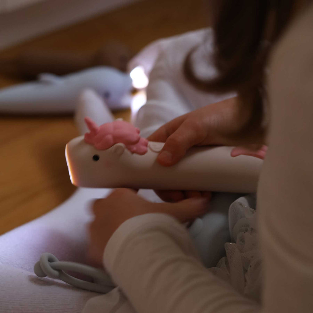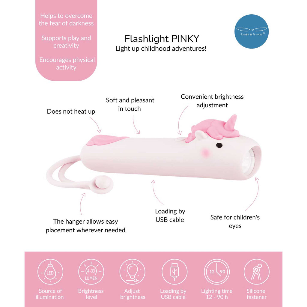 Die Taschenlampe Einhorn von Rabbit & Friends verbindet praktische Funktion mit einem Hauch Magie: weich ummantelt mit BPA-freiem Silikon, handlich und liebevoll gestaltet. Perfekt, wenn es abends noch eine Geschichte gibt, wenn im Flur Licht gebraucht wird oder wenn aus der Höhle unter der Bettdecke ein kleiner Wohlfühlort wird.