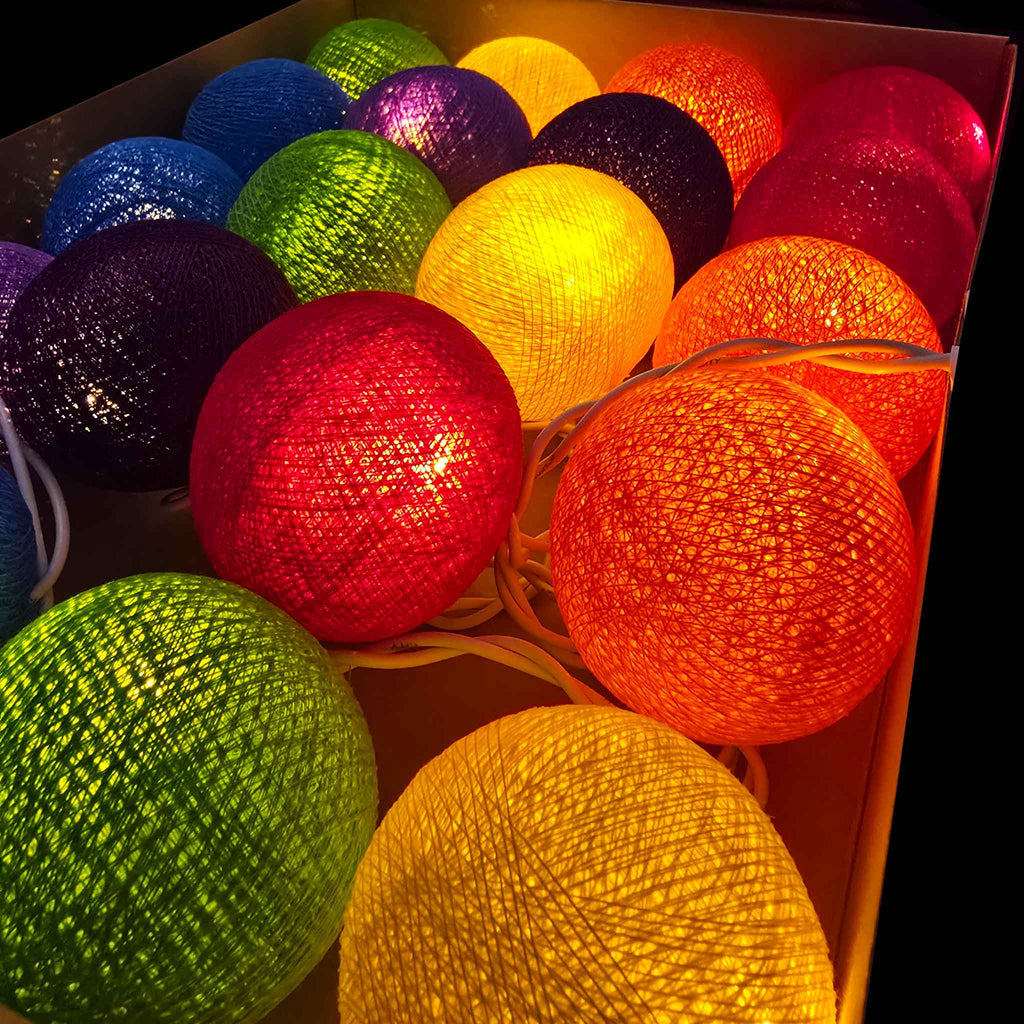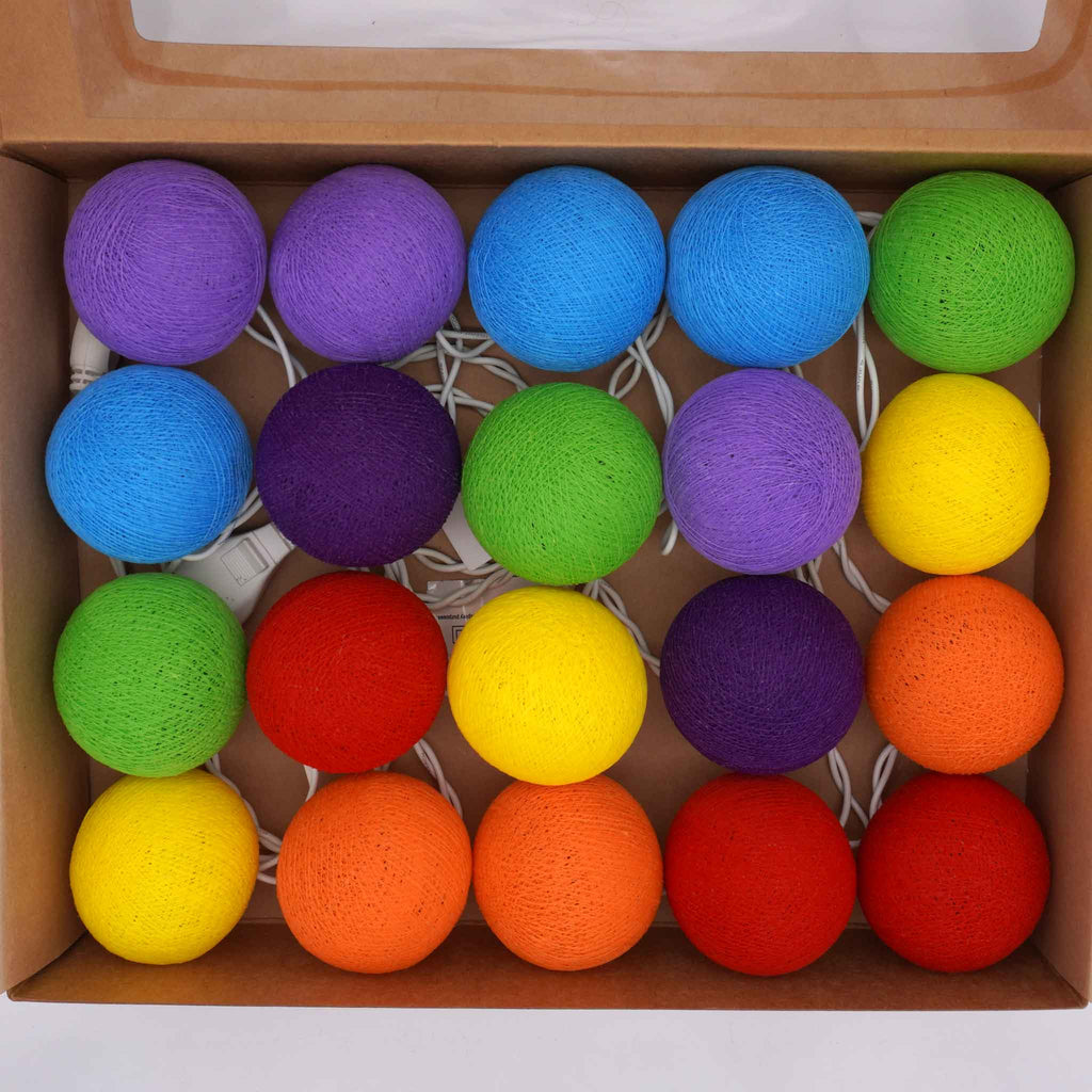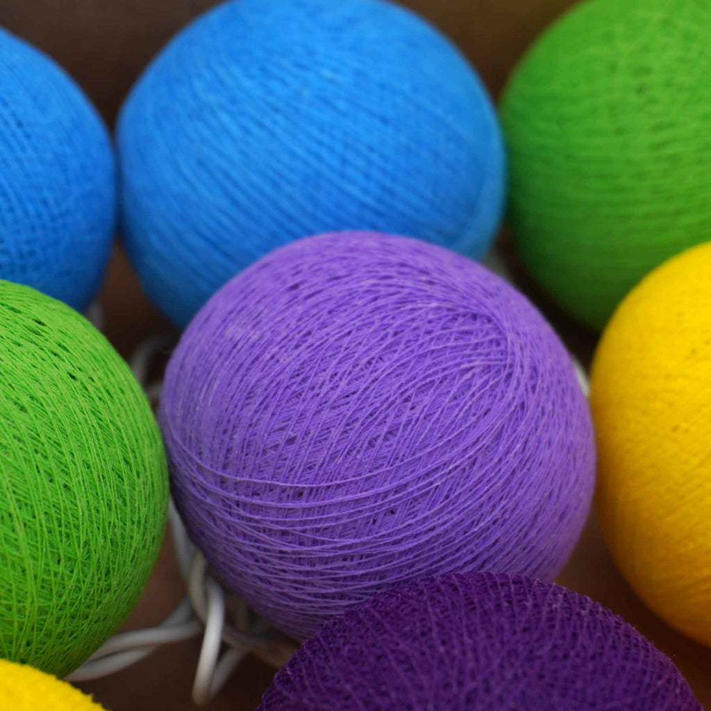 Die Lichterkette Rainbow wird in liebevoller Handarbeit gefertigt. Jeder Ball besteht aus naturbelassener Baumwolle und begeistert mit einer kräftigen, leuchtenden Farbgebung. Die harmonisch abgestimmten Farben reichen von Rot über Orange, Gelb, Grün, Türkis, Blau bis hin zu Lila und Violett – ein echter Hingucker, bei Tag und bei Nacht.