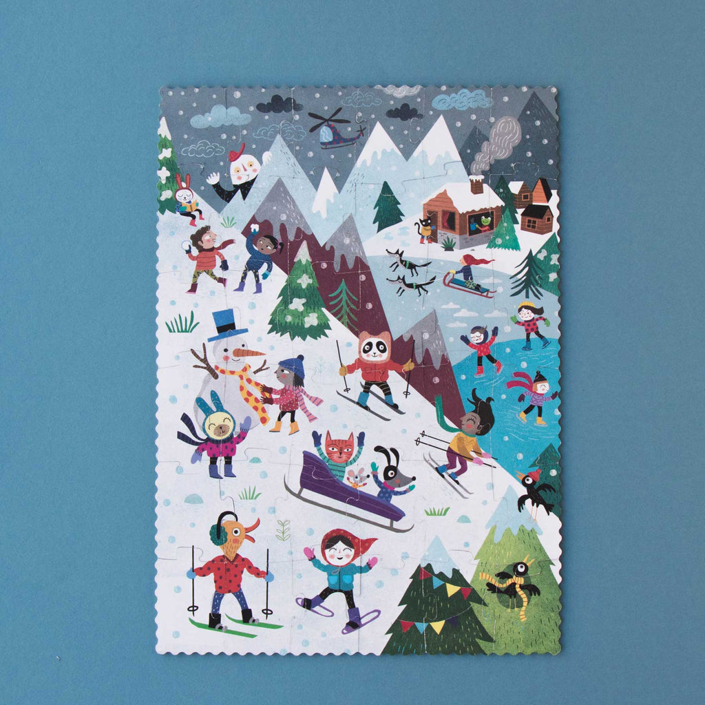 Heute glitzert der Schnee, morgen duftet die Wiese – mit dem wendbaren Londji-Puzzle „Let’s go to the Mountain“ reisen Kinder gleich zweimal in dieselbe Bergwelt. Einmal ist alles winterweiß: Skier raus, Schlittschuhe an, Schneemann bauen – und zwischendurch huschen kleine Figuren über den zugefrorenen See.