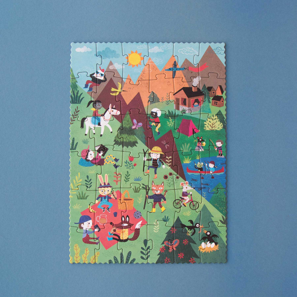 Dreht ihr das Puzzle um, wird’s sommerlich-bunt: Die Sonne steht über den Gipfeln, ein Picknick liegt schon bereit, jemand reitet durchs Grün, und am Wasser wartet das nächste Abenteuer – inklusive Paddeln und Entdecken.
