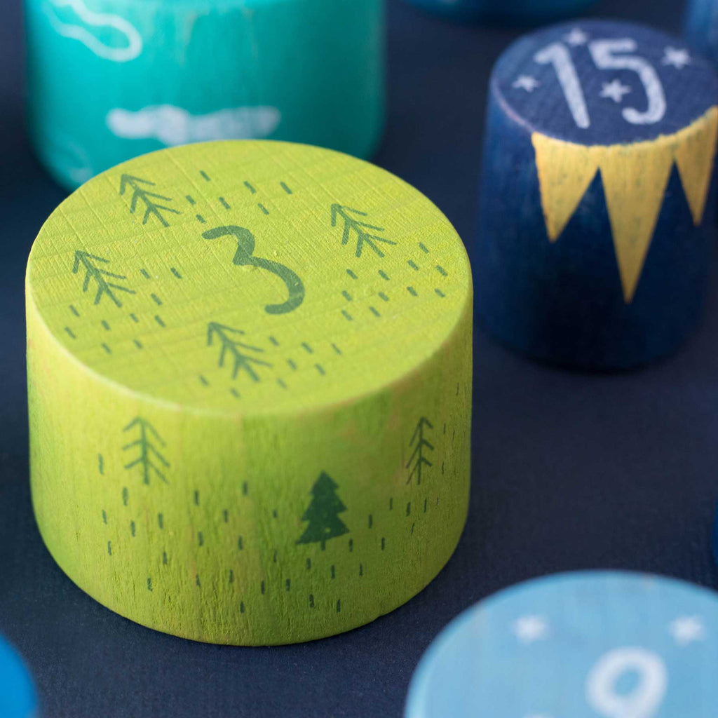 • 15 nummerierte Holzteile (1–15) zum Stapeln