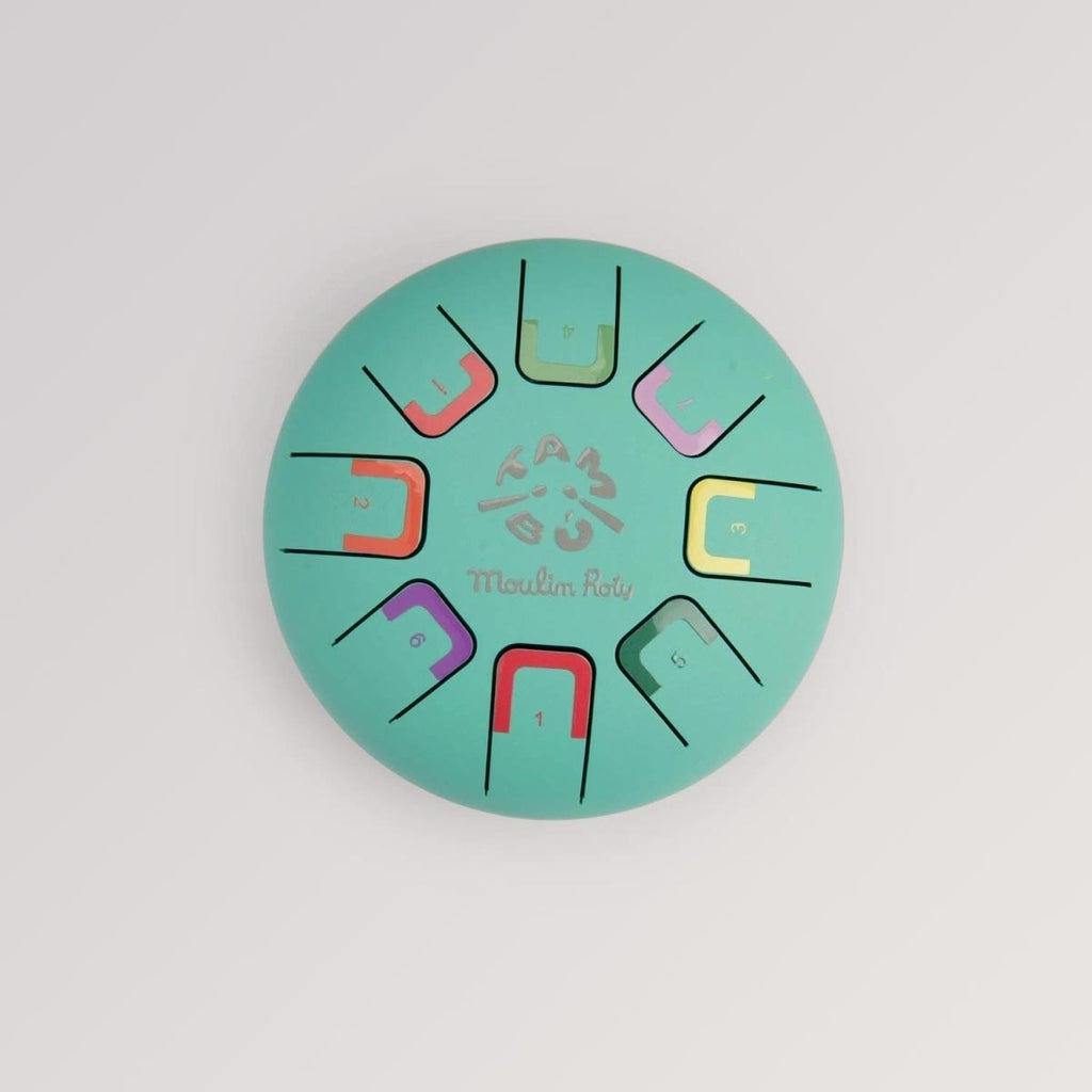 Die kleine Zungentrommel ist der ideale Einstieg in die Welt der Percussion. Auf dem handlichen, mintgrünen Korpus liegen acht klar abgegrenzte Zungen, jeweils mit Farbe und Zahl markiert – perfekt zum Nachspielen einfacher Folgen („1–2–3“) oder zum freien Improvisieren. Angespielt mit Schlägeln, Händen oder Fingerpicks entsteht ein weicher, heller Klang mit kurzer, angenehmer Nachklingzeit – ideal fürs Kinderzimmer.