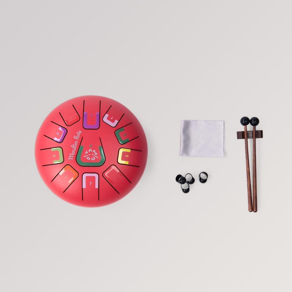 Die Zungentrommel „Popipop" von Moulin Roty ist das perfekte Instrument, um Kinder spielerisch mit der faszinierenden Welt der Percussion vertraut zu machen. Diese robuste und stilvoll gestaltete Trommel verfügt über 11 verschiedene Noten, die jeweils mit einer eigenen Farbe und Zahl versehen sind. Passend dazu sind auch im beiliegenden Notenheft alle Melodien farblich gekennzeichnet – so können Kinder ganz einfach und intuitiv Melodien und Töne nach Farben spielen.