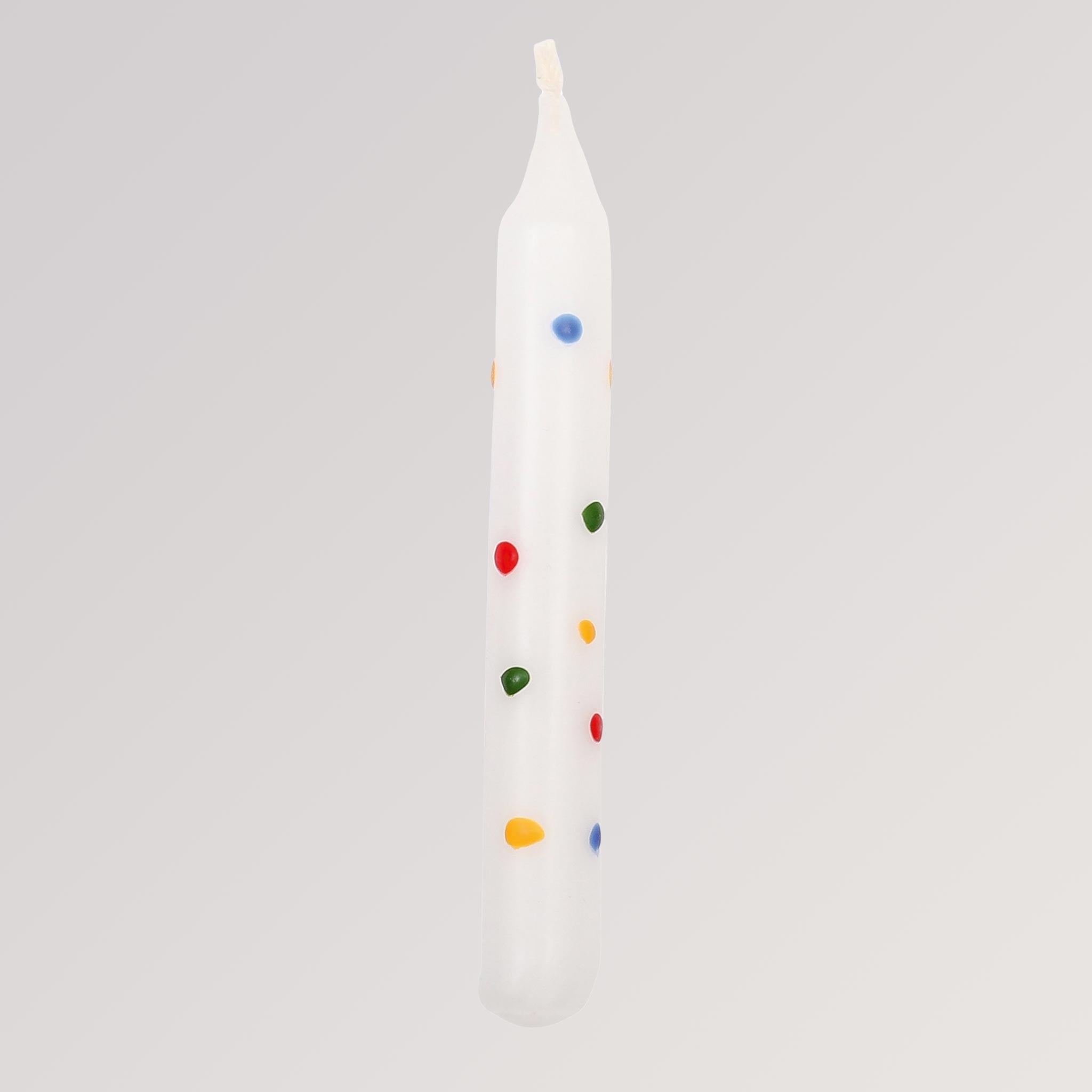 Die handbemalte Geburtstagskerze „Konfetti" von Ahrens bringt mit ihrem weißen Grundton und den vielen bunten Punkten echte Feierlaune auf den Tisch. Wie fröhlich verstreutes Konfetti sorgt sie für eine verspielte, festliche Stimmung – ideal für Kindergeburtstage.