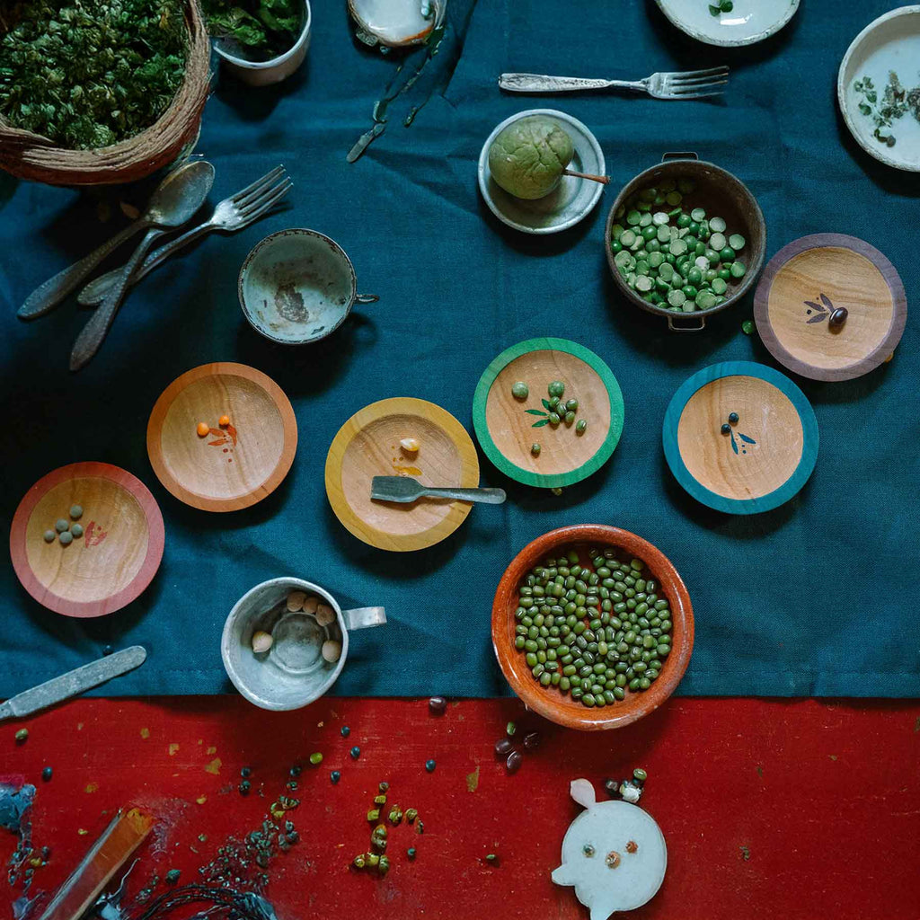 Manchmal braucht es gar nicht viel: ein paar schöne Tellerchen – und schon entsteht ein ganzes Fest. Dishes von Grapat sind kleine Holzschälchen, die zum Anrichten, Sammeln, Sortieren und Servieren einladen – für das nächste Fantasiefrühstück, den Marktstand oder die Puppen-Teestunde.