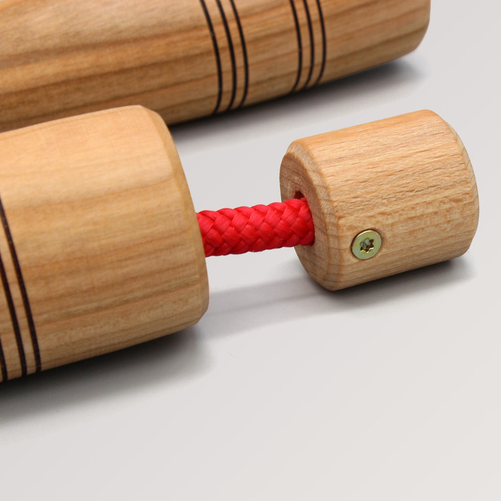 Die durchdachte Befestigung des Seils mit einer Torx-Schraube erlaubt einen Austausch oder Ersatz mit Seilen anderer Längen oder Farben. Der kleine Holzkonus, an dem das Seil befestigt ist, sitzt fest und versteckt in den beiden Griffen. Dies wird mit einem strengen Sitz des Seils im vorderen Loch des Drehgriffes realisiert. Soll das Seil getauscht werden, schiebt man das Seil in die Drehgriffe, und die Befestigungen kommt zum Vorschein. Nachhaltigkeit beginnt bei der Qualität.