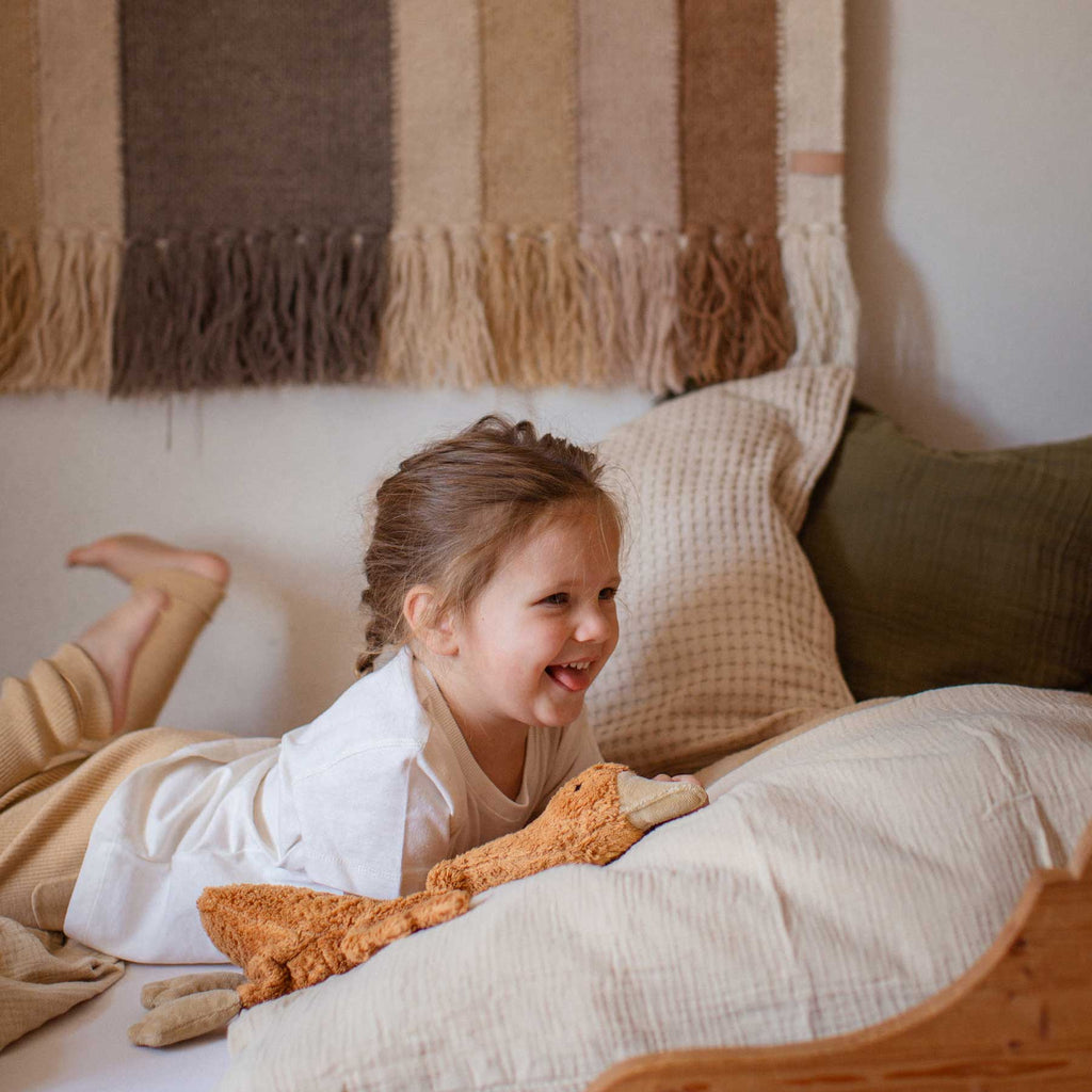 Die kleine Gans in rostrot von Senger Naturwelt ist ein zartes Trosttier und praktisches Wärmekissen in einem. Außen lädt weicher GOTS-zertifizierter Bio-Baumwollplüsch zum Knuddeln ein, innen sorgt eine Füllung aus reiner Schafschurwolle für behagliche Weichheit. Im Bauch steckt ein herausnehmbares Körnerkissen mit Traubenkernen – ideal zum sanften Wärmen oder erfrischenden Kühlen. So begleitet die Gans kleine Alltagssorgen, Einschlafmomente und gemütliche Kuschelzeiten mit wohliger Nähe.