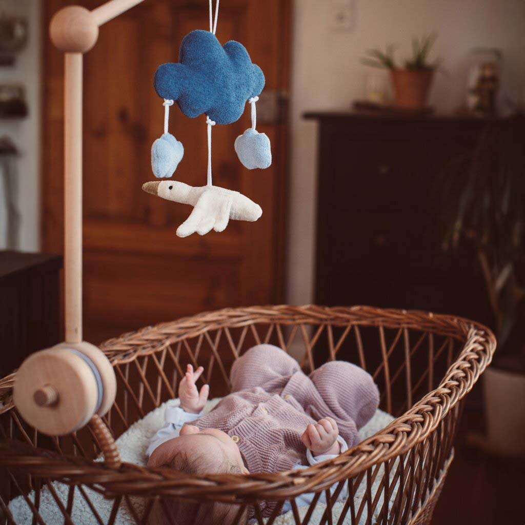 Das bezaubernde Mobile „Sonnenuntergang“ von Senger Naturwelt bringt sanfte Bewegung und Geborgenheit ins Kinderzimmer. Die zarten Blautöne der Wolken und die kleine Gans schweben beruhigend über dem Bettchen – perfekt, um den Tag ausklingen zu lassen. Dank der praktischen Schlaufe an der großen Wolke lässt sich das Mobile im Handumdrehen befestigen, und die kleinen Wolken oder die Gans können bei Bedarf abgenommen und separat genutzt werden (z. B. als liebevolle Anhänger).