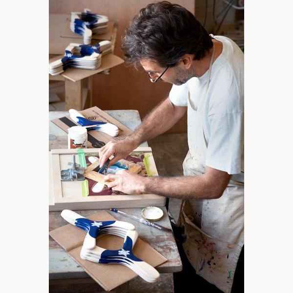 Für Stéphane haben umweltfreundliche Materialien und Prozesse höchste Priorität. Er hat sich auf die Gestaltung hochwertiger Freizeit-Bumerangs für Kinder, Jugendliche und Erwachsene spezialisiert. Jeder Bumerang wird in Frankreich von Hand gefertigt und bemalt. Es handelt sich somit um Unikate. Jeder einzelne Bumerang wird von Stéphane handsigniert.